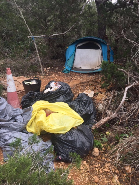 Según ha informado el Ayuntamiento de Sant Antoni, los voluntarios dieron aviso a la Policía Local que se personó en el lugar para levantar acta y comunicó la situación a la empresa municipal de limpieza. Hoy se procederá a retirar las tiendas y otros residuos voluminosos.
