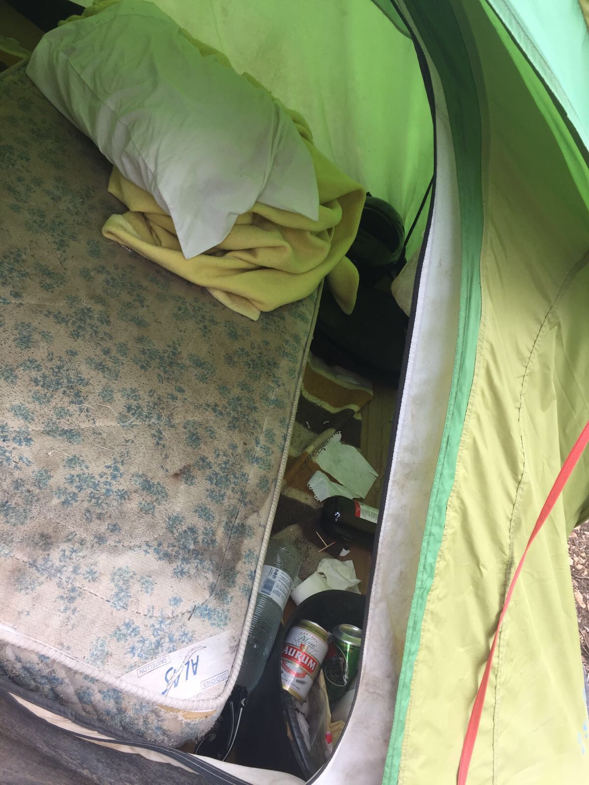 @Noudiari/Los voluntarios que participaban el sábado en una nueva jornada de limpieza en sa Talaia de Sant Antoni hallaron en la zona algunas tiendas de campaña en las cuales había colchones, mantas, botellas y gran cantidad de basura en los alrededores.