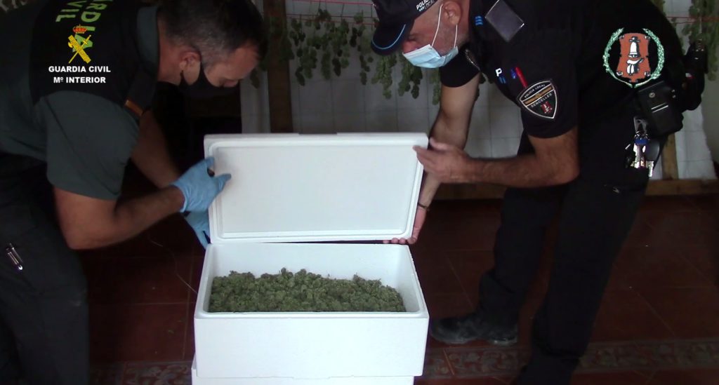 Los guardias civiles y policías locales encontraron 40 kilos de la sustancia ya seca, varios de ellos almacenados en cajas.