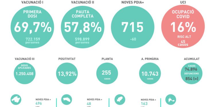 Según los datos hechos públicos este domingo por el Govern, la tasa de positividad de las pruebas diagnósticas en la última jornada es del 13,9 % y el Servicio de Salud atiende por covid-19 a 10.743 pacientes, un 6,5 % más que la víspera.