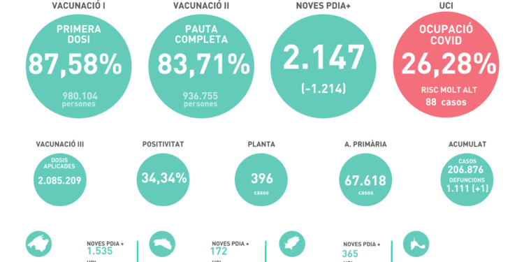 Salud ha notificado este domingo 2.147 nuevos casos de covid, por lo que Baleares alcanza los 206.618 positivos desde el inicio de la pandemia en una jornada en la que suma un fallecido más y eleva a 1.111 la cifra oficial de decesos por el virus en las islas.