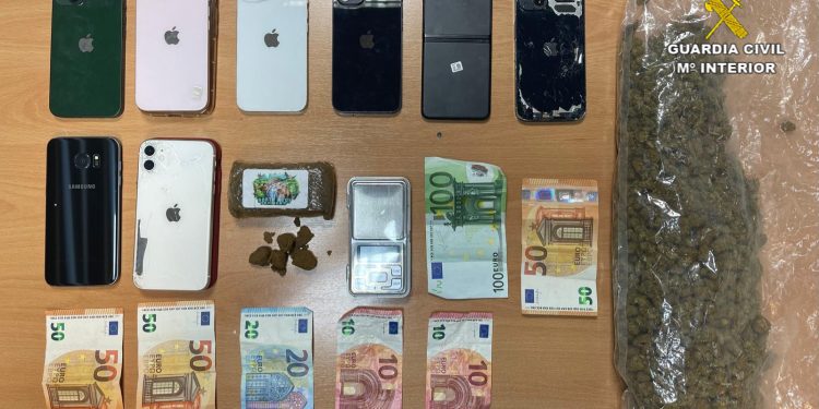 Tras realizar un cacheo superficial e inspeccionar la bolsa, la patrulla se percata de que esta contiene una balanza de precisión, 282 gramos de marihuana, 107 gramos de hachís y ocho teléfonos móviles, de los cuales no pudo justificar su procedencia. También portaba consigo 290 euros fraccionados en billetes de diverso valor.