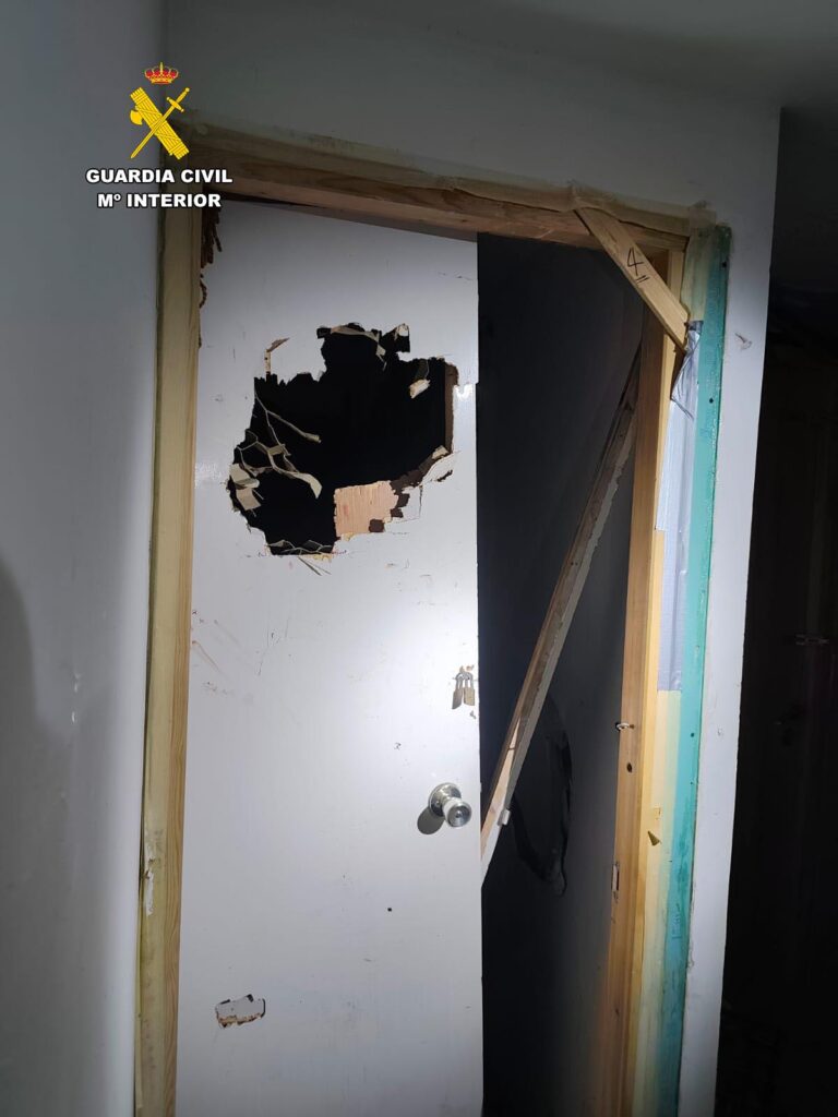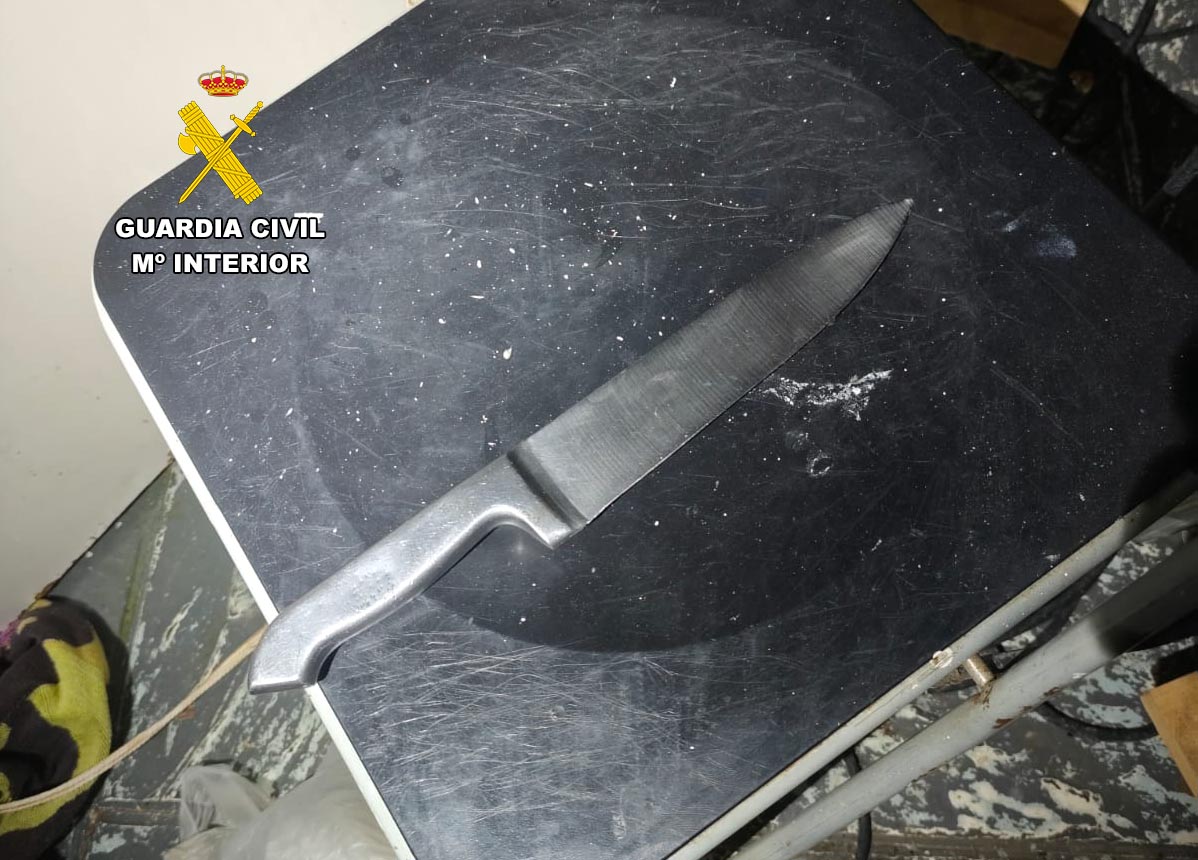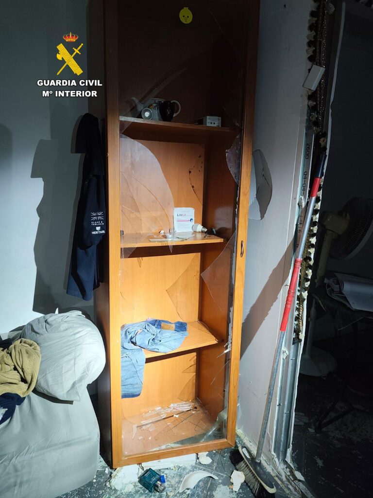 Si bien, esta es solo la segunda parte de este suceso. Los agentes pudieron comprobar, según explica la Guardia Civil en una nota de prensa, que la vivienda mostraba numerosos destrozos. Según la versión de dos hombres que residían en el domicilio y que estaban presentes durante el altercado, el detenido había hecho un gran agujero en la puerta de la habitación en la que ellos dormían con un cuchillo de grandes dimensiones. A su vez intentó agredirles a través de la puerta destrozada y amenazó con matarles. La agresión no quedó ahí, ya que según el testimonio de los residentes, el presunto autor de los hechos también les roció con un bote de ácido y les dijo que les quemaría vivos.