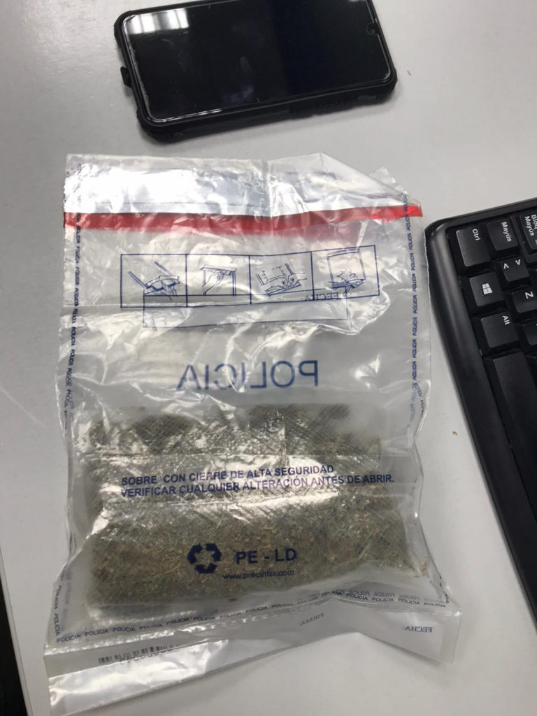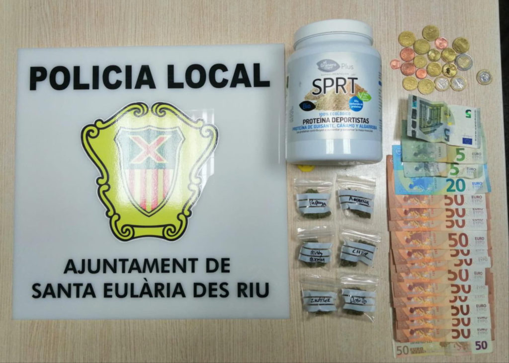 Tras reiterar su ofrecimiento el agente se identificó motivo por el que el hombre comenzó a ponerse nervioso y a realizar aspavientos, por lo que se procedió a su inmovilización. En un registro, se intervinieron seis bolsas con marihuana listas para su distribución, tres de las cuales estaban ocultas en un bote de suplemento nutricional para deportistas. Además, se le intervinieron una veintena de billetes supuestamente vinculados a las transacciones de drogas. Tras detener al individuo acusado de un presunto delito contra la salud pública los agentes solicitaron la presencia de personal de Can Dog para trasladar a un refugio a un perro propiedad del detenido.