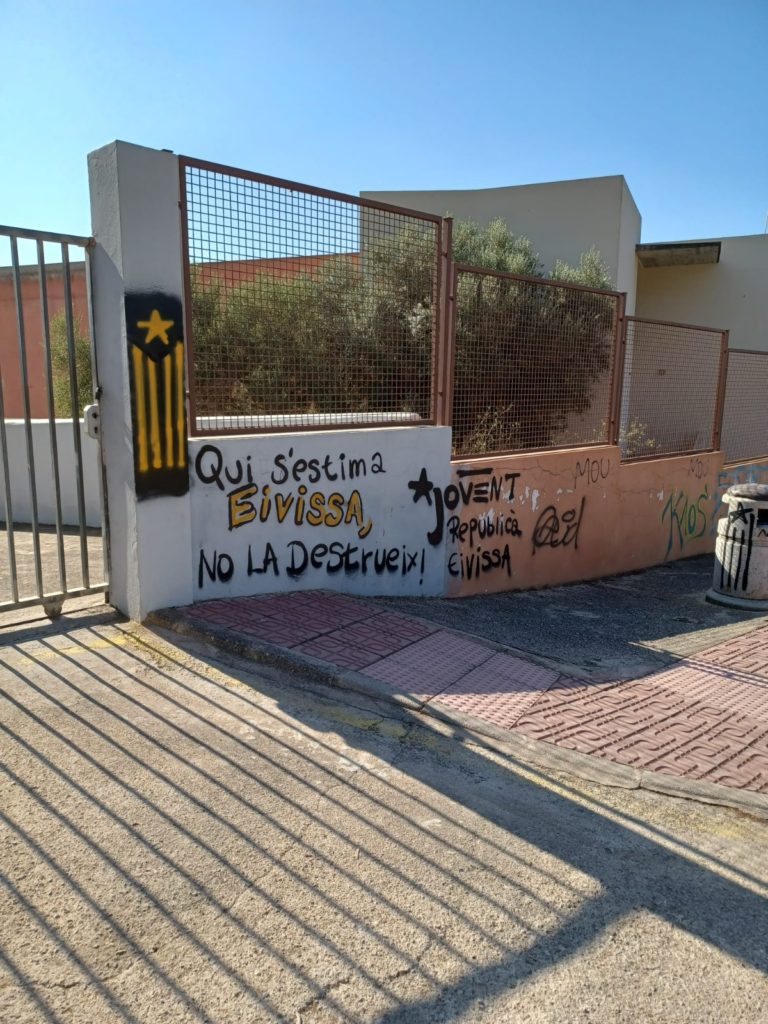 D’altra banda, aquest diumenge van aparèixer pintades independentistes a diferents indrets del municipi de Sant Antoni de Portmany, tal com es pot comprovar a les següents imatges difoses per l’Ajuntament de la localitat. «Qui estima Eivissa, no la destrueix» o «Independència» són alguns dels lemes que han fet servir els autors d’aquesta acció directa, que també han fet ús de cartells i adhesius independentistes.