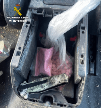 Una patrulla en servicio de Seguridad Ciudadana dio el alto al vehículo ocupado por los dos hombres y en el registro encontraron oculto bajo una modificación del habitáculo, un paquete con 170 pastillas de éxtasis, 27,5 gramos de 2CB, también conocido como TUSI, cocaína y un arma blanca, ha informado la Guardia Civil en una nota.