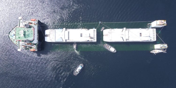 El carguero Red Zed 1 llegó a Ketchikan en abril para abordar el plan de anclaje, trincado y transporte de los fast ferris Fairweather y Chenega, nombres de las embarcaciones compradas por Trasmapi para reforzar sus servicios en las Pitiusas. La maniobra comenzó con la inmersión del carguero, a última hora de la noche del jueves al viernes, para, después, mediante dos remolcadores, cargar los dos ferris en su cubierta.