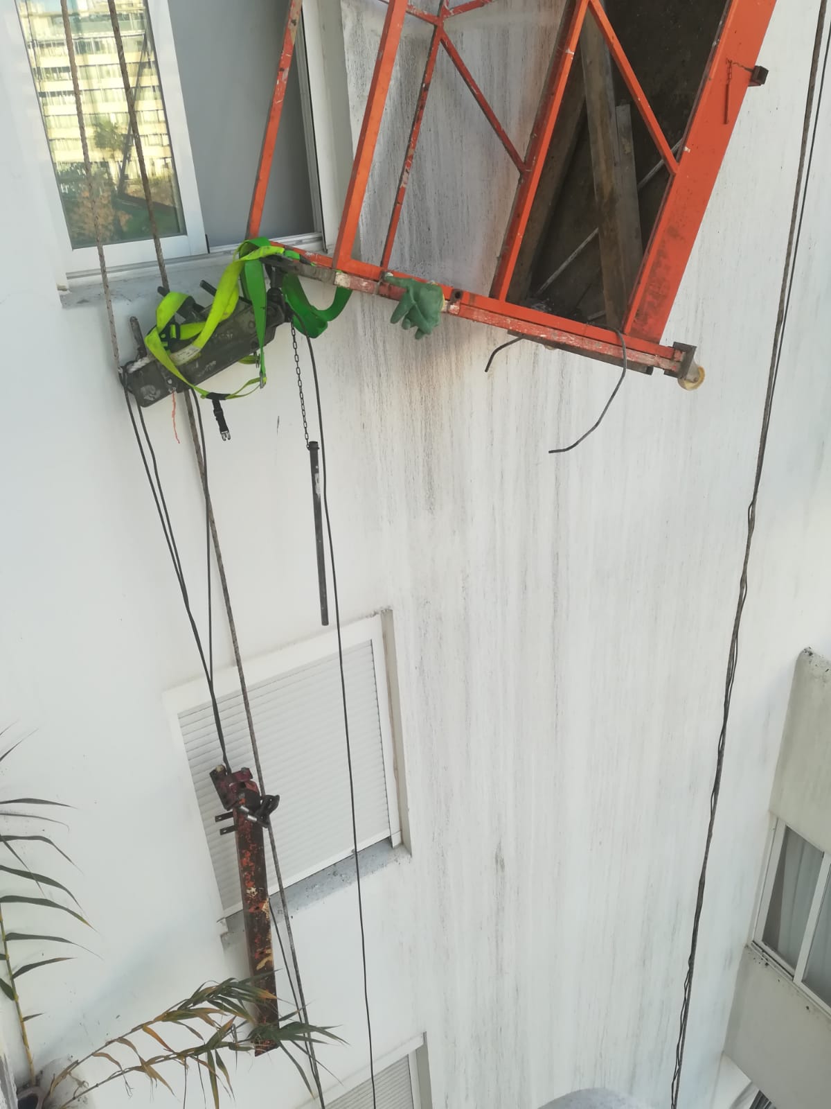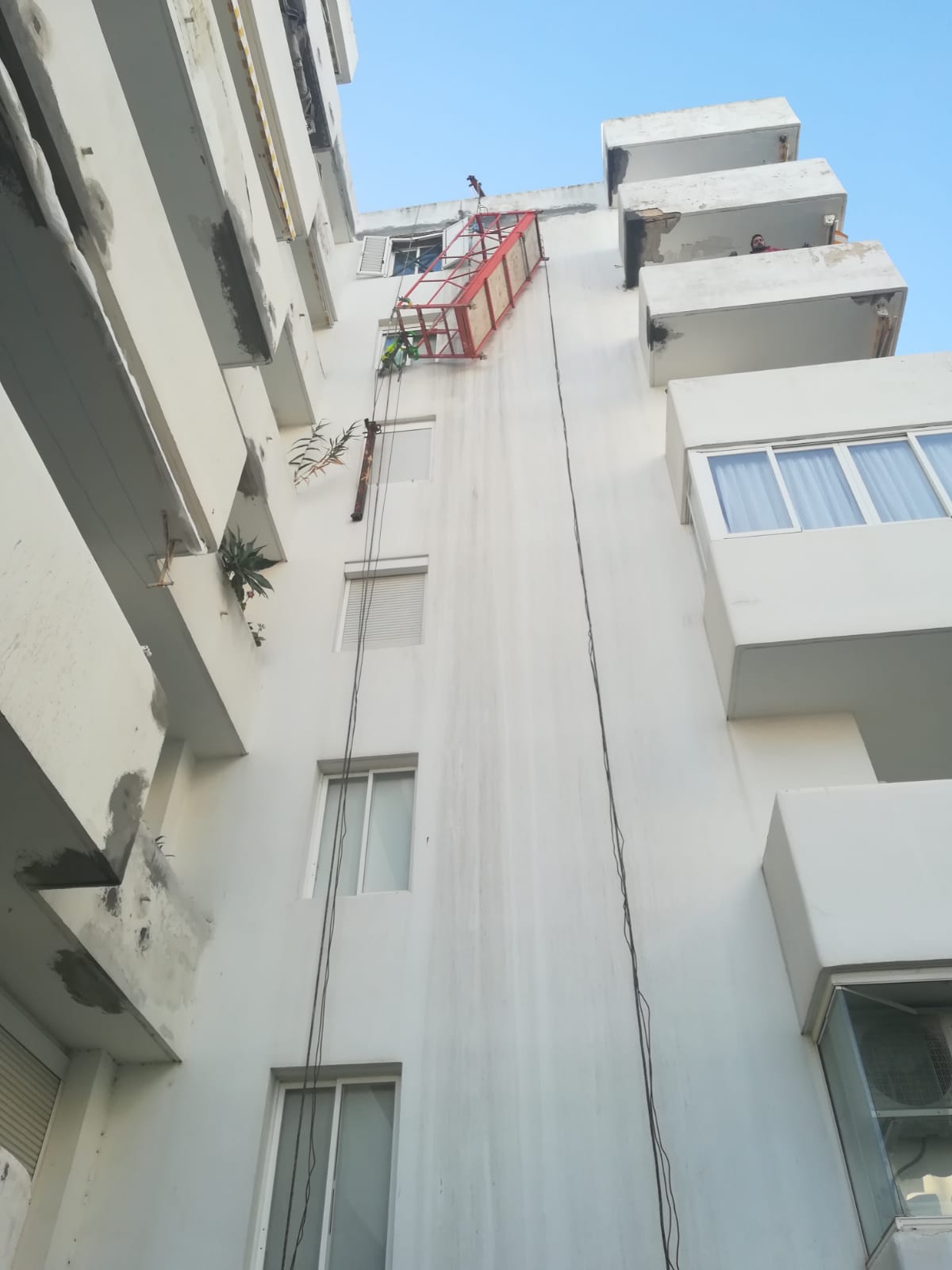 @Noudiari / Dos pintores que trabajaban esta mañana en uno de los edificios Fiesta, situados a la avenida Vuit d’Agost de Vila, han quedado suspendidos de las cuerdas de seguridad durante unos minutos después de que la plataforma donde trabajaban se haya roto por uno de los lados, según han informado los agentes de la Policía Local. El suceso ha tenido lugar sobre las 9.15 horas de la mañana.