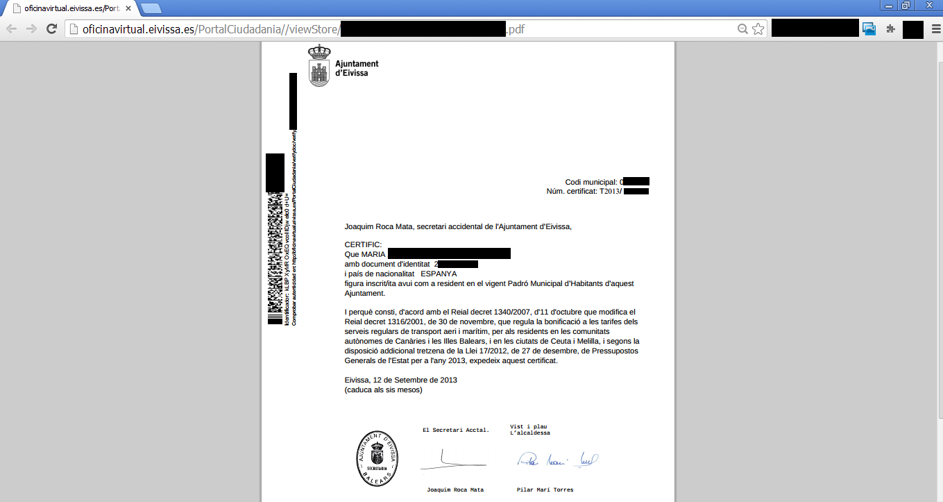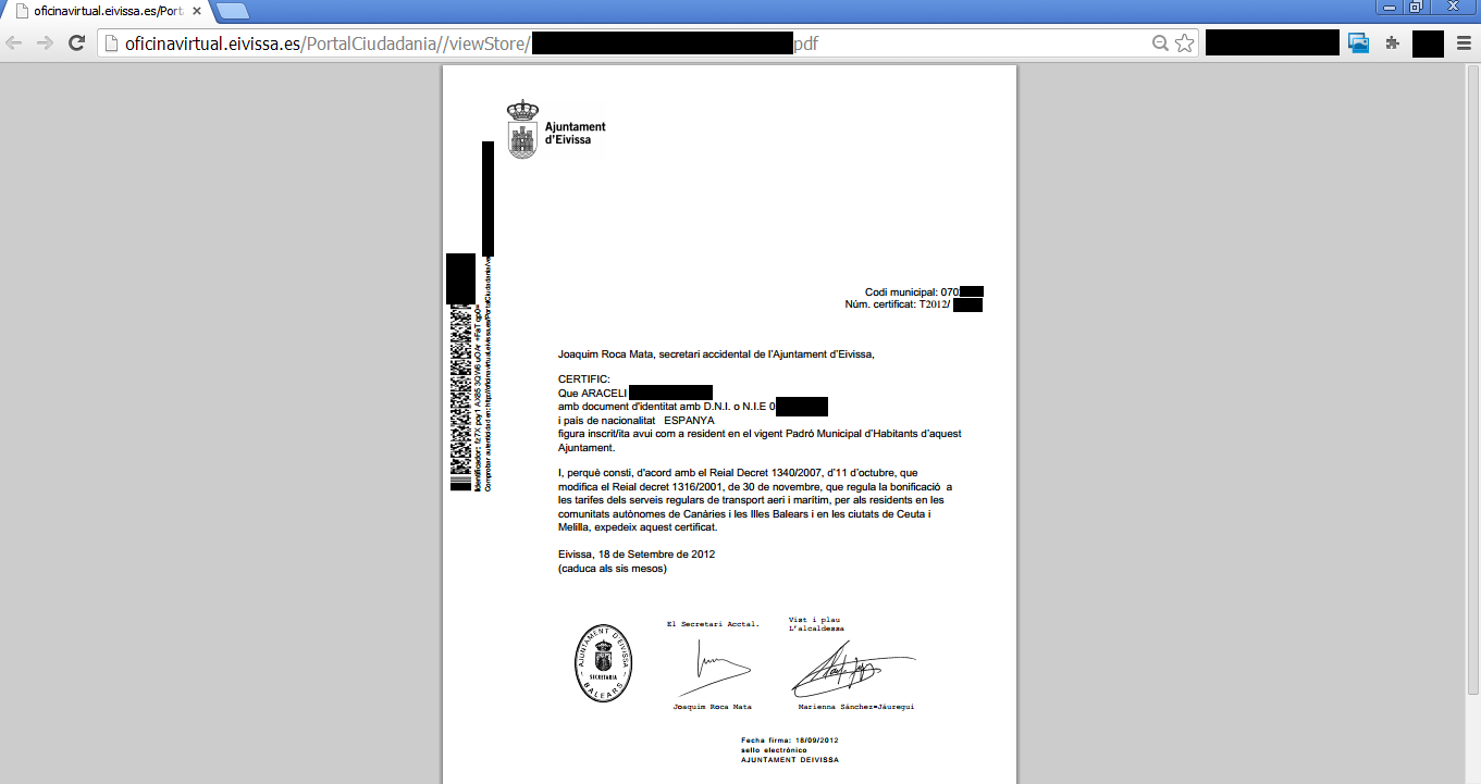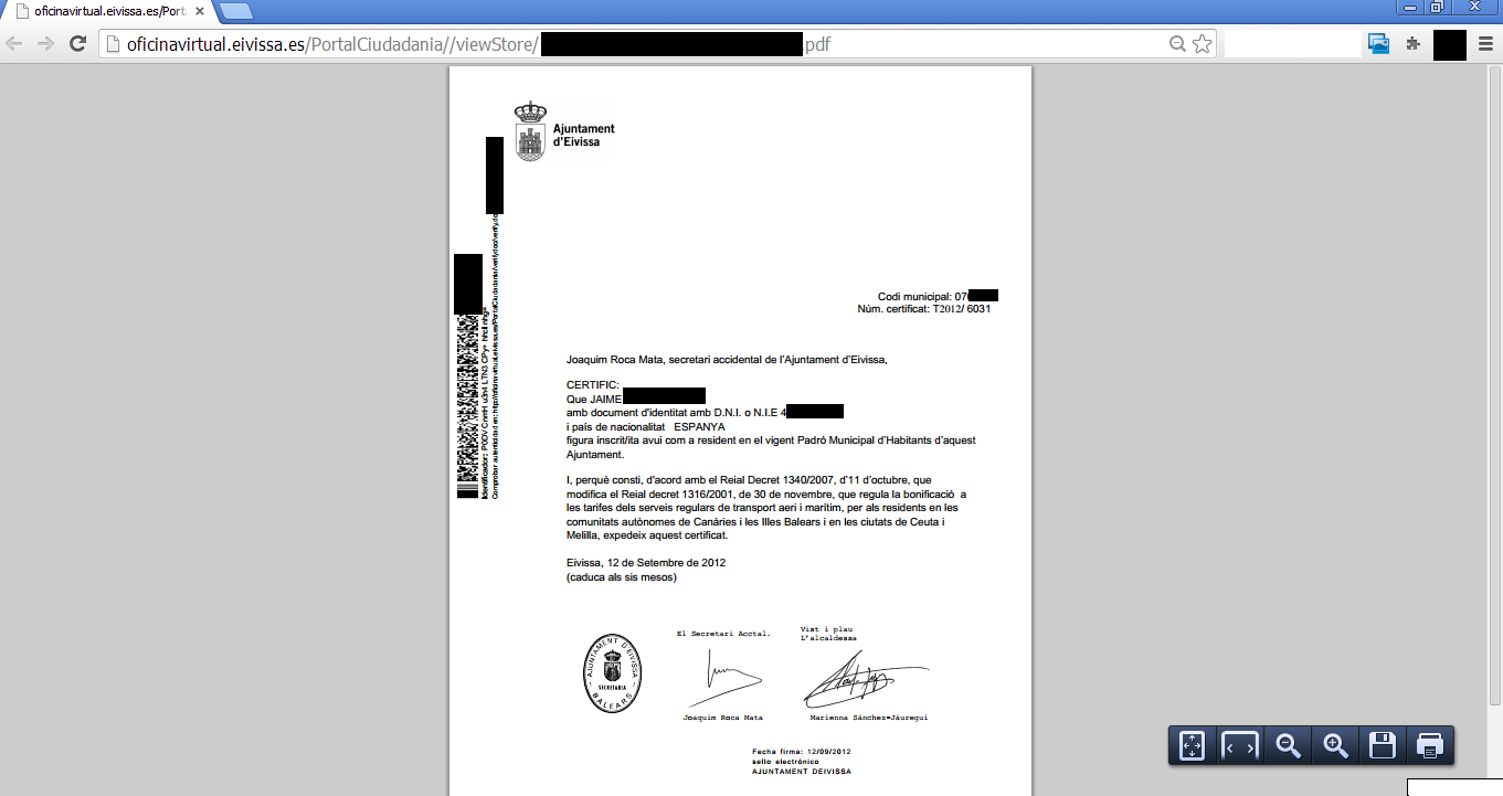 Imagen del certificado de residencia que muestra los datos privados de un vecino de Vila.