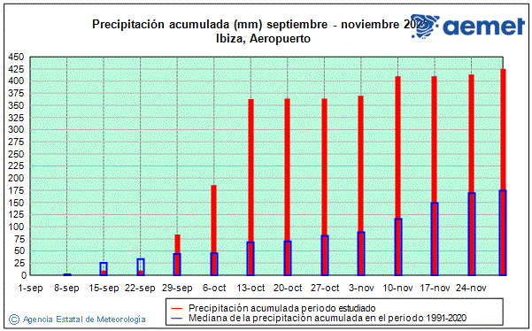 En relación con las condiciones de escasez hídrica, en noviembre de 2025 la isla pasó de tener sus reservas hídricas al 37% a un nivel de reservas al 47% , según el Portal de l’Aigua de les Illes Balears. En octubre y noviembre de 2025 se sucedieron numerosos episodios de lluvias, como puede verse en la gráfica bajo estas líneas. Sin embargo, tanto Ibiza como Formentera están consideradas como zonas de estrés hídrico extremo, como publicó Noudiari recientemente, en el Atlas de la desertificación en España que vio la luz este pasado mes de diciembre.