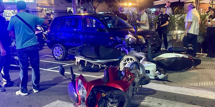 ACTUALIZACIÓN: IBA DROGADO No ha habido heridos de milagro. Un vehículo ha perdido el control esta tarde en pleno centro del municipio de Ibiza y ha acabado impactando contra varias motocicletas que estaban aparcadas en la intersección entre las calles Abad y la Sierra y Sant Cristòfol.