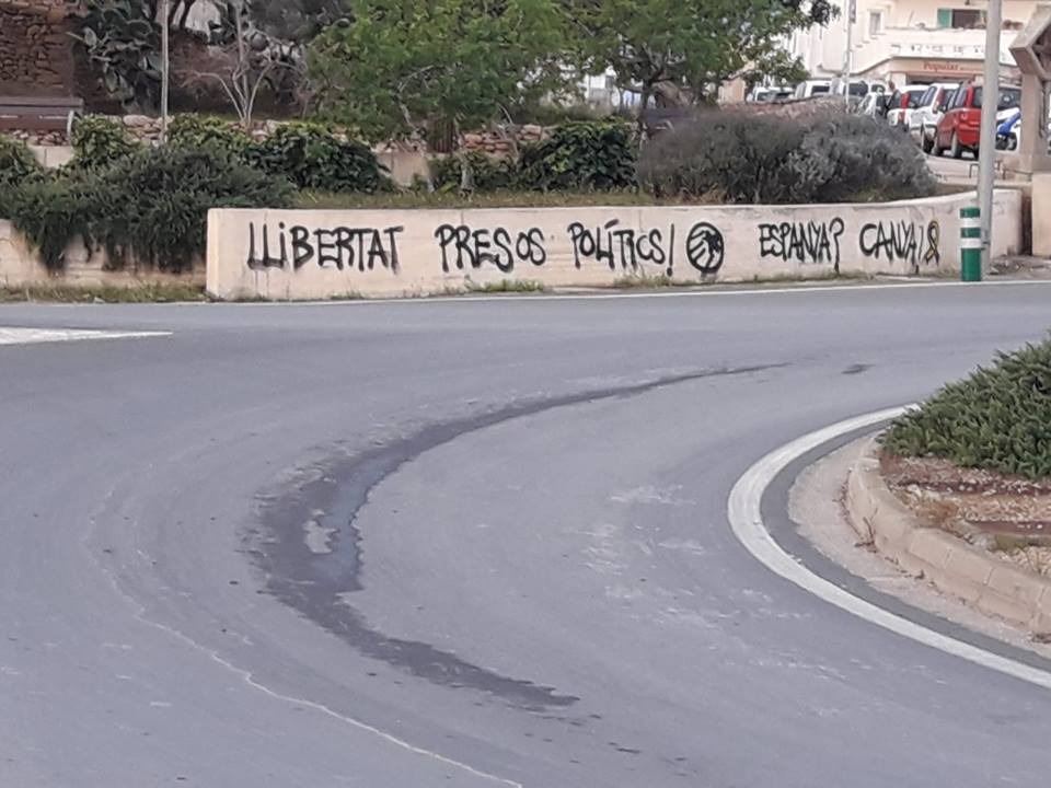 @Noudiari / El Consell de Formentera ha recibido este lunes quejas de pintadas, entre ellas las del PP, realizadas en numerosos puntos de la isla como en la pared del Cementerio Viejo, la pared del Cine, vallas de obras, mobiliario urbano y otros lugares privados. Las pintadas son de carácter independentista y en favor de los políticos presos, así como en contra de las Fuerzas y Cuerpos de Seguridad del Estado.