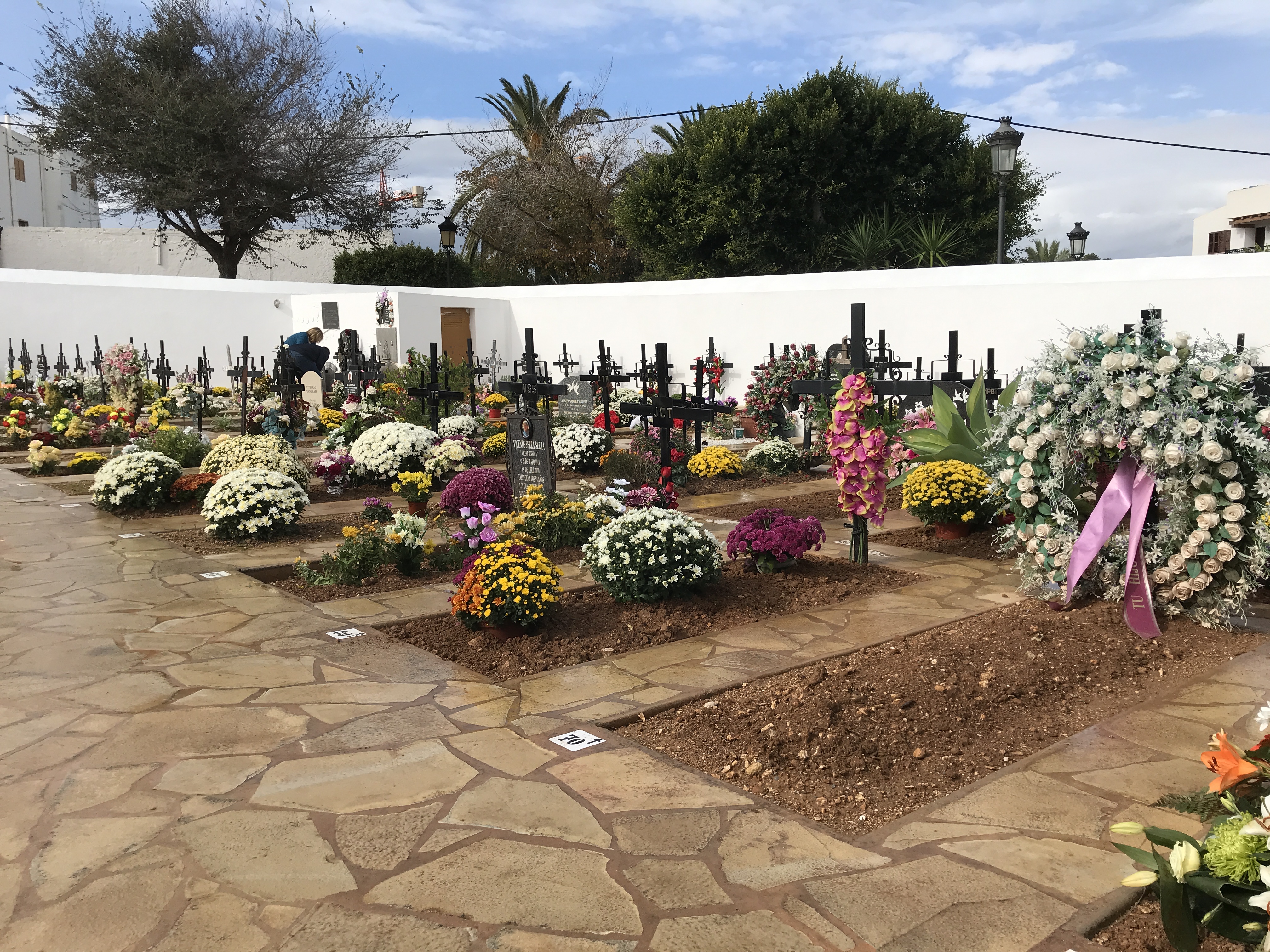 La cantidad de flores y recuerdos depositados en las tumbas es asombroso. Forman un paisaje multicolor que hace olvidar en qué espacio están situados. La fragancia hace que el recuerdo sea cariñoso y se aleje de la melancolía. Unas seis personas acicalan con mimo las lápidas de sus seres queridos, como si en aquel esfuerzo residiera la clave del descanso eterno.