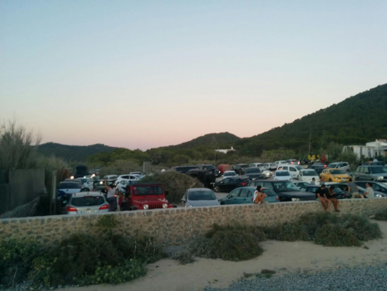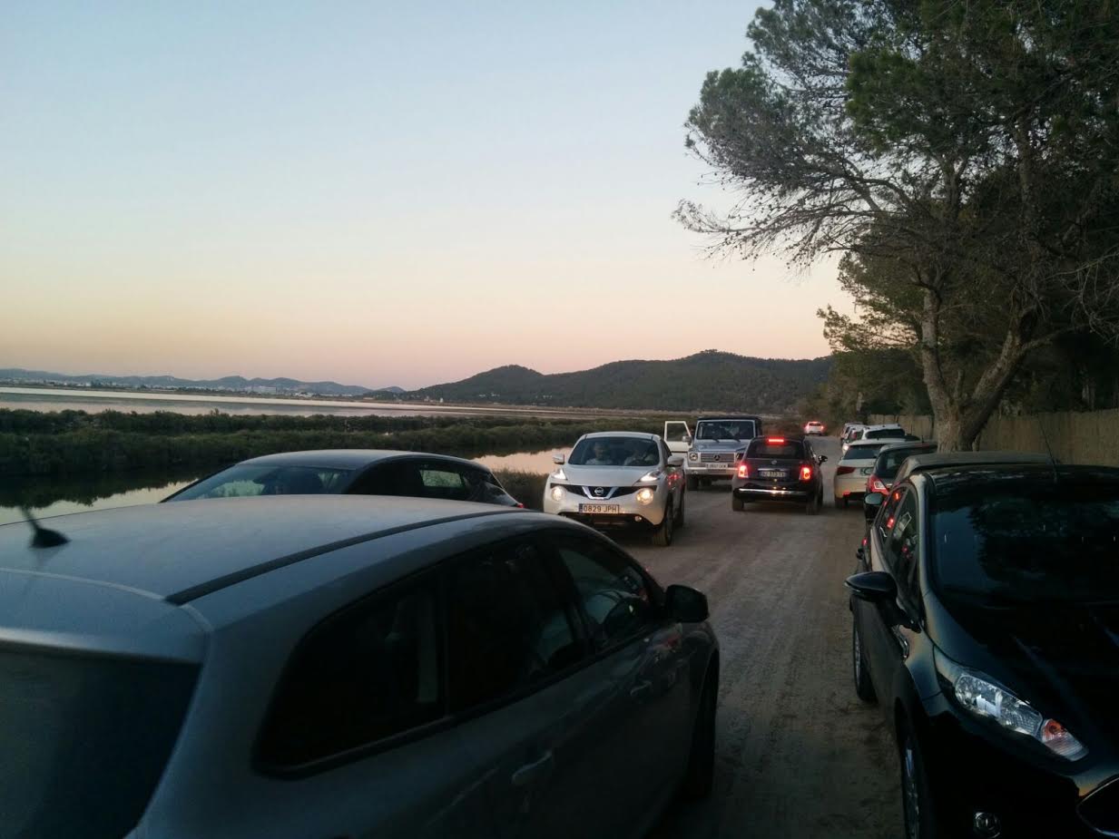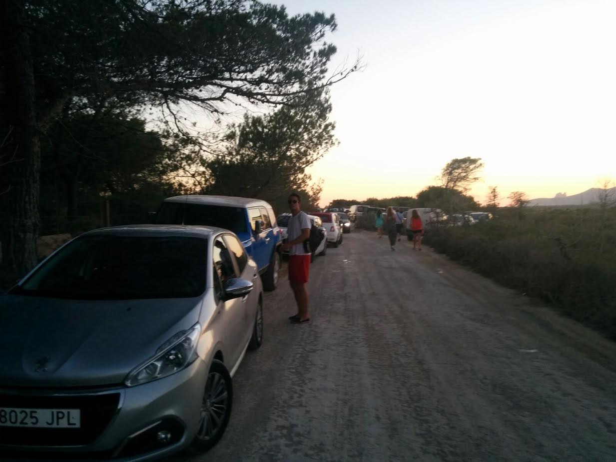 @B.R./ A pesar de que es verano y estamos en pleno mes de agosto aún hay algunas imágenes que sorprenden y más si se trata de un espacio protegido y dentro del Parque Natural de ses Salines como es la zona de Es Cap des Falcó. Durante el pasado fin de semana se podía observar cómo el camino que da acceso a la zona estaba repleta de vehículos, igual que lo estaba el mismo aparcamiento. A esta situación de caos circulatorio hay que añadirle la música del restaurante que se encuentra en dicho enclave. Una música que resonaba por toda la zona.