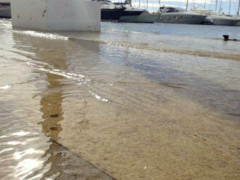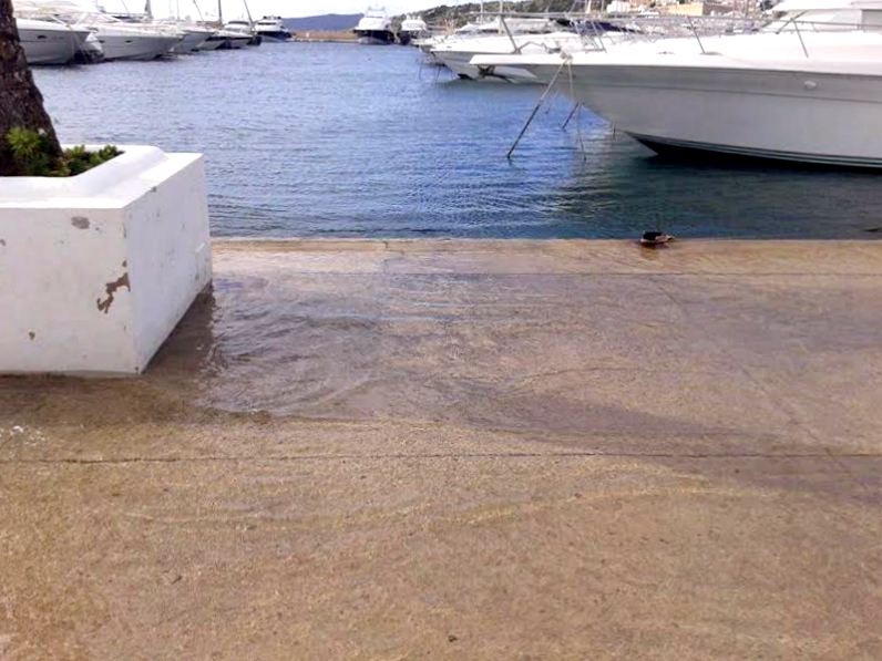 @Noudiari / El mar ha subido este lunes por encima de los límites del muelle de Marina Botafoch y ha anegado la zona de tránsito rodado y paseo de este puerto deportivo de la ciudad de Ibiza. No es una circunstancia nueva. Este hecho se ha repetido en varias ocasiones en los últimos años, principalmente en días de mal tiempo, que puede ser el motivo por el que ha sucedido en esta oportunidad.