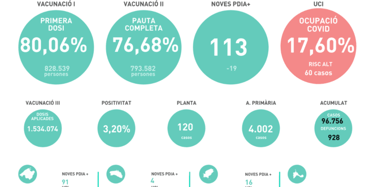 De los 113 nuevos casos, 91 se han detectado en Mallorca, donde hay 52 hospitalizados en UCI, 90 en planta y 2.964 enfermos en sus casas o en los hoteles habilitados por el Govern.