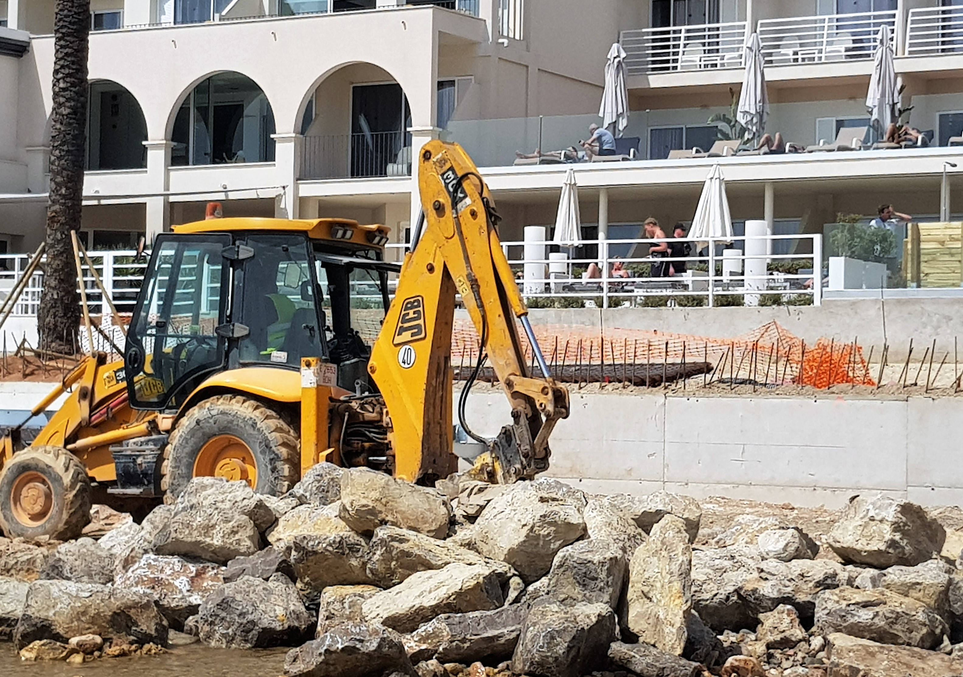 Maquinaria pesada trabaja enfrente de los turistas alojados en un hotel de Figueretes
