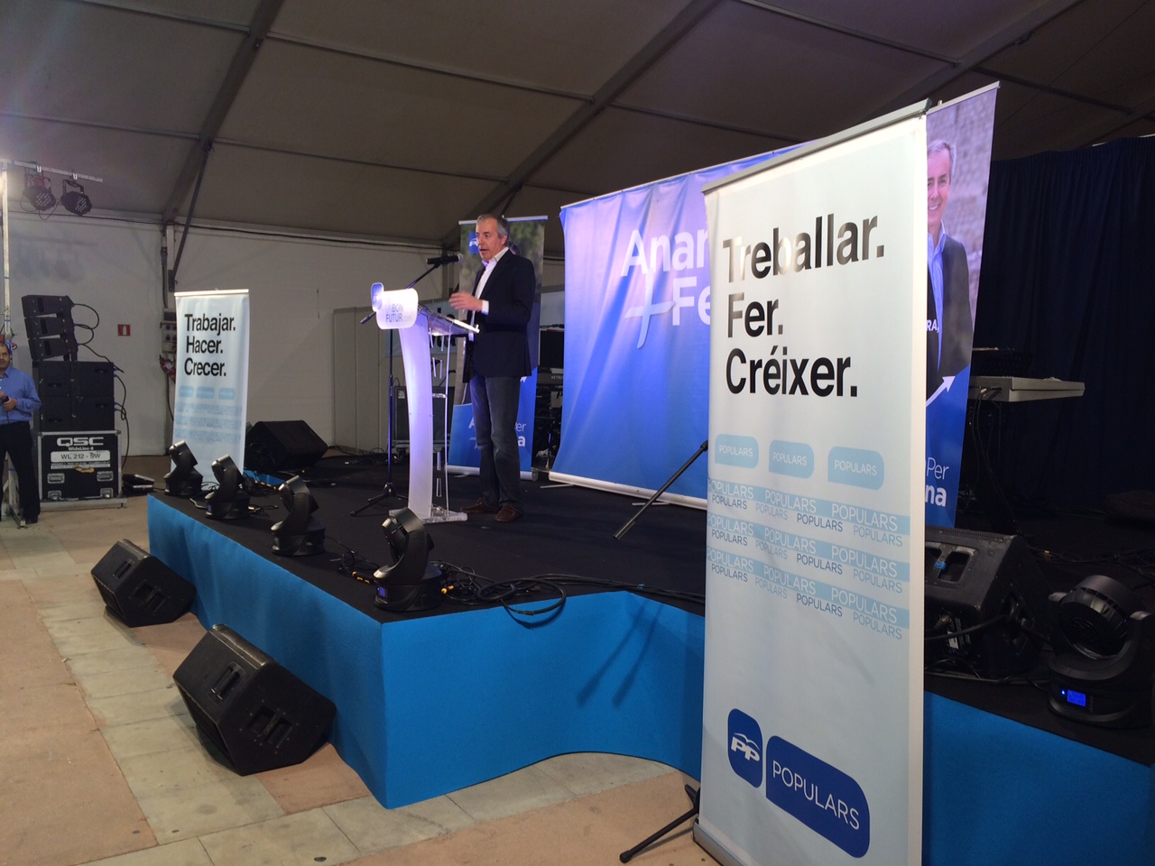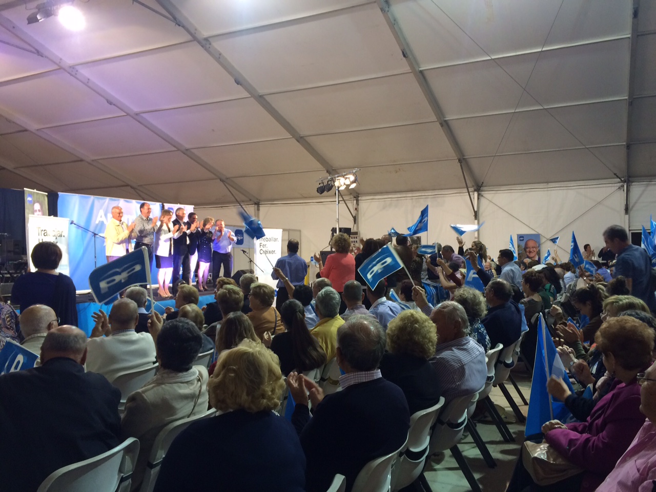 @B.R./ Algo está cambiando. Lejos quedaron los mítines en el espacio principal del Recinto Ferial con pantallas gigantes, asientos por doquier y autobuses repletos de gente. Esta noche, el Partido Popular ha realizado su fin de campaña en la carpa anexa al Recinto Ferial, ocupando la mitad, con la presencia de medio millar de personas. En el aparcamiento, hasta cuatro autobuses de 55 plazas cada uno. Uno procedente de Sant Miquel, otro de Santa Eulària, de Sant Josep y de Sant Agustí. Estos dos últimos ocupados por 13 y 6 personas, respectivamente, y el concejal de Sant Josep, Javier Marí, a pie de puerta del autocar para saludar personalmente a cada uno de los pasajeros. De hecho, este mismo concejal también llegó al volante de una furgoneta empapelada por propaganda de la formación. El que hasta hace un tiempo era presidente de la Pimeef y ahora aspirante a concejal en la candidatura de Vila, Joan Tur Ripoll, llegó con un montón de sombreros de merchandising bajo el brazo. Yo me lo guiso, yo me lo como y aquí todo el mundo arrima el hombro.A pesar de que el acto estaba previsto que empezara a las nueve de la noche, no lo hizo hasta media hora más tarde. Y menos mal, porque algún candidato como el de Sant Antoni, José Sala, llegó con el tiempo más que justo.