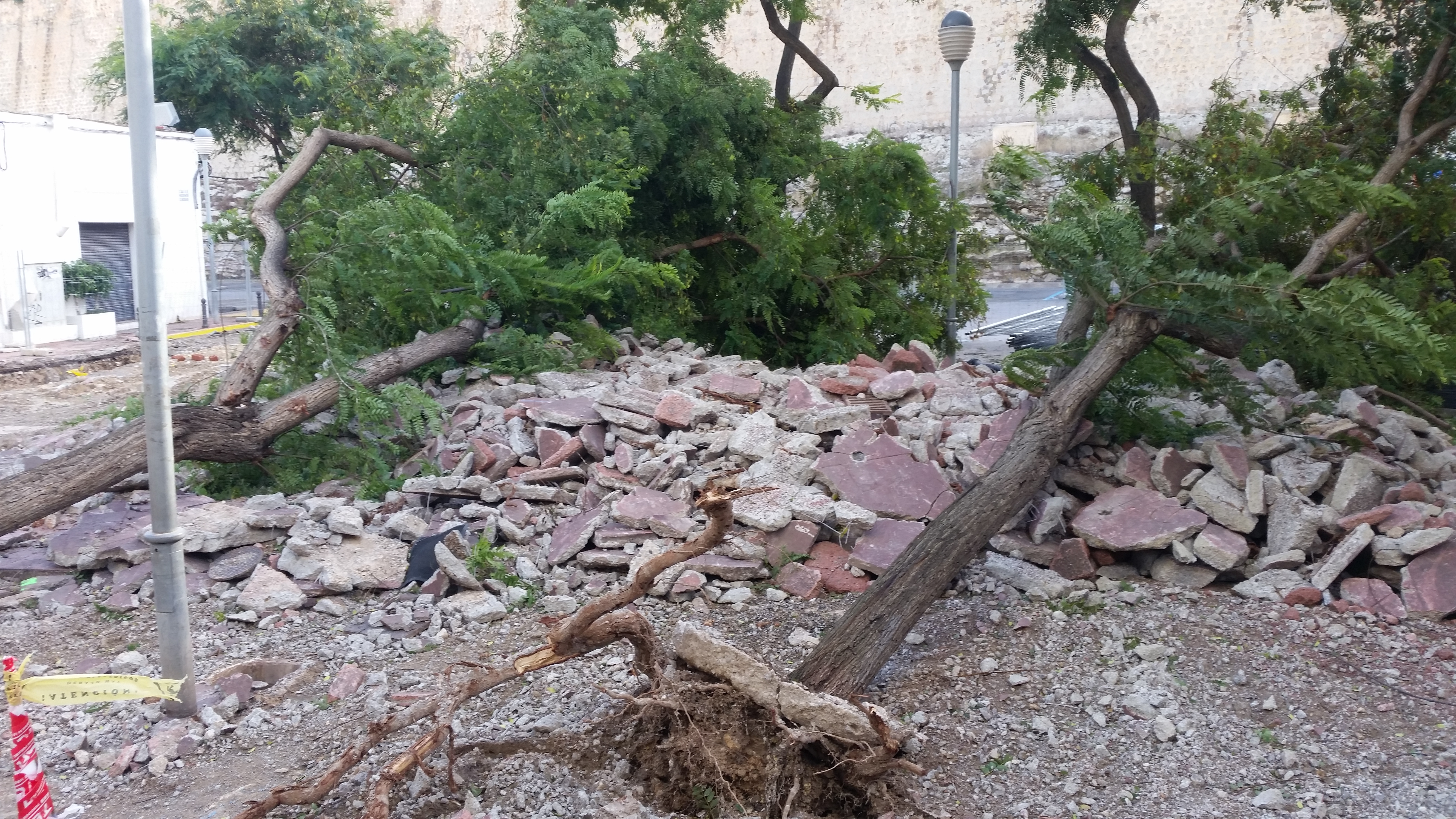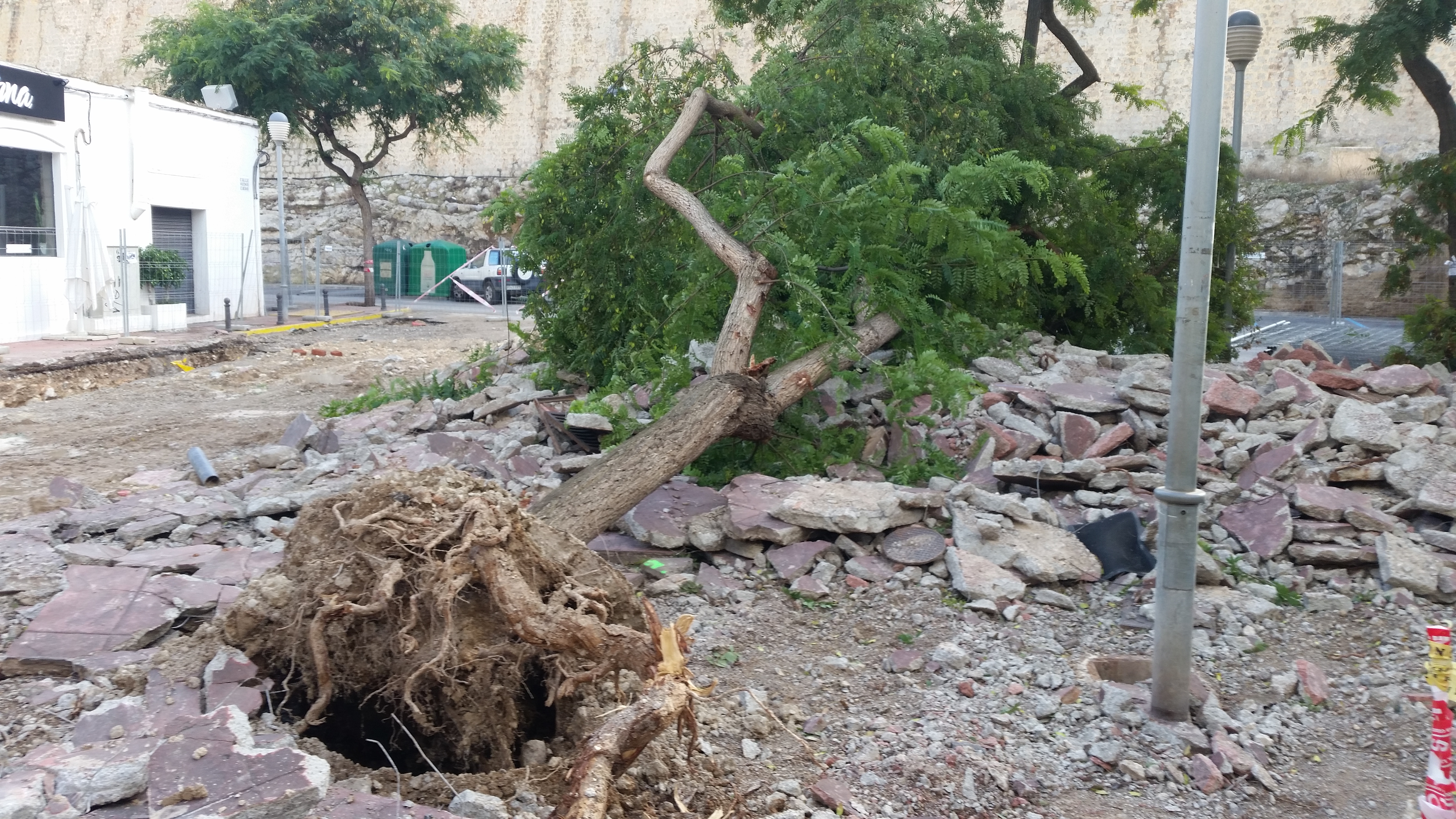 @Noudiari/ Debido al temporal de viento de las últimas horas, se han producido en la ciudad de Ibiza varias incidencias, entre las que se pueden destacar la rotura de un árbol y la caída de otros 12 en la plaza del Parque, prácticamente todos en la fachada norte y la zona central. Durante la noche, un tiupana ha quedado rota por la mitad y otros siete tipuanas y cinco ficus han caído porque no han soportado la fuerza del viento.