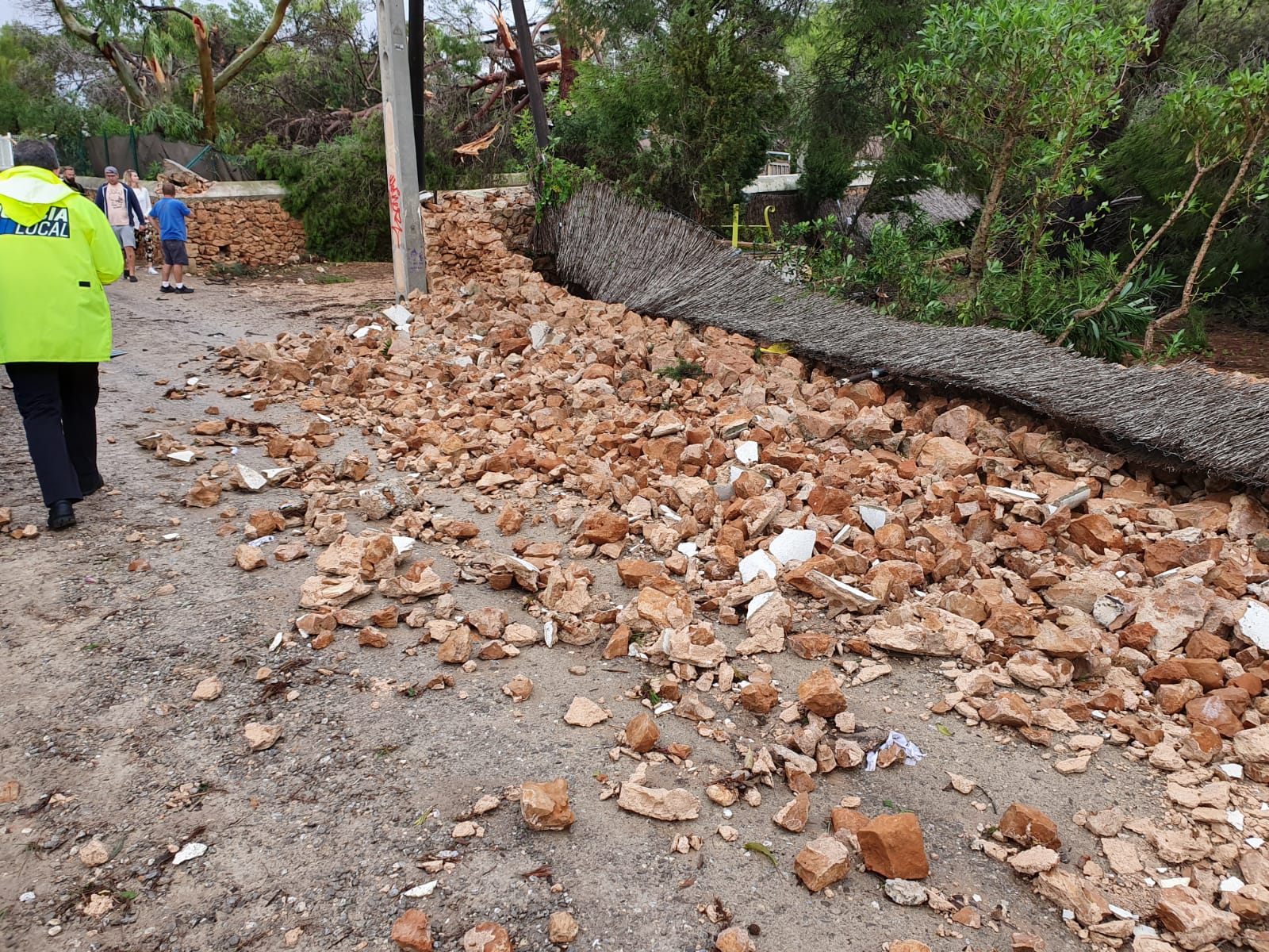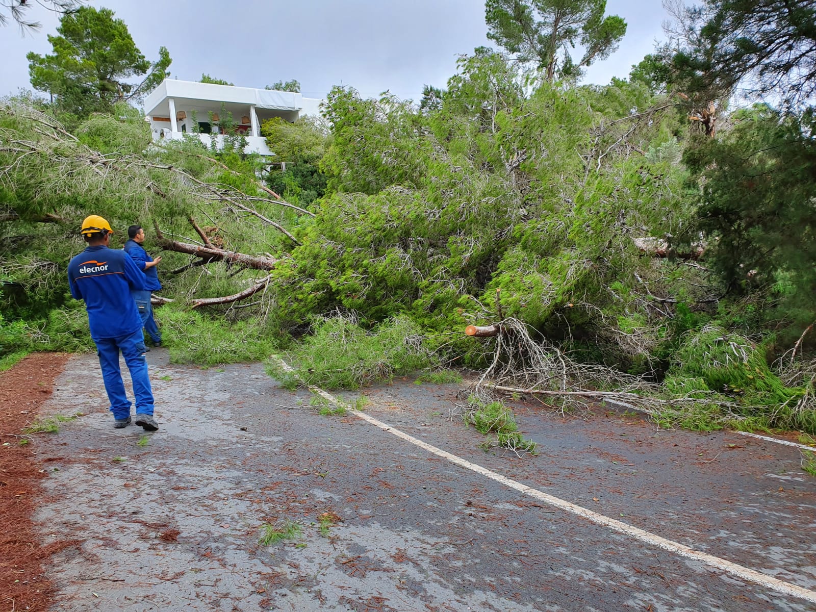 @Noudiari / La Policía Local de Sant Antoni, junto a Protección Civil y la brigada de obras municipal están trabajando para subsanar las incidencias provocadas por el temporal registrado esta mañana en el municipio, que ha ocasionado numerosos desperfectos y caída de árboles.