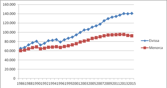 Gràfic comparatiu de la població d’Eivissa i Menorca des de l’aprovació de la Llei Electoral de les Illes Balears