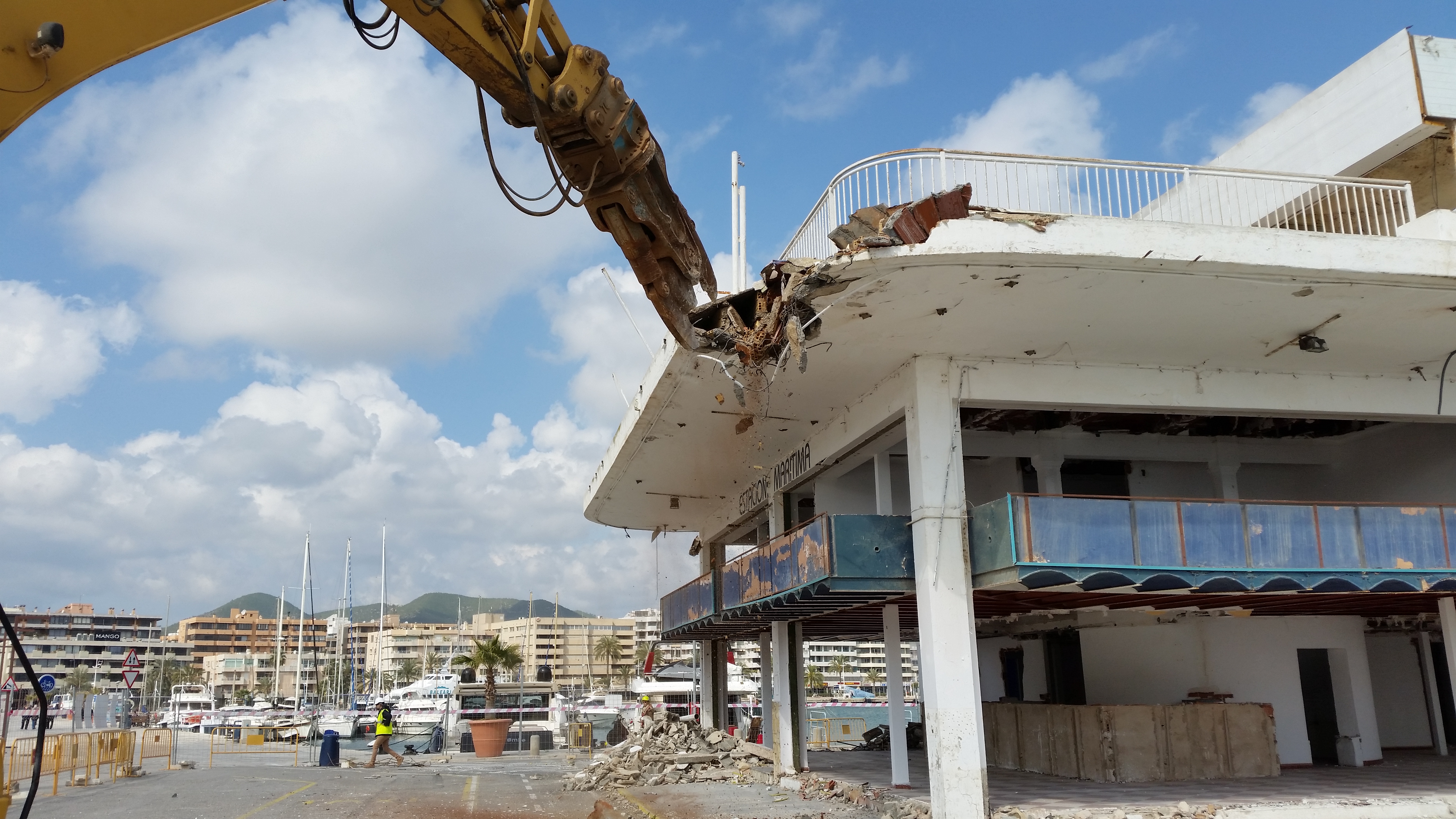 @Noudiari/Las obras de derribo de la antigua estación marítima de Ibiza, ubicada en el muelle de Es Martell, han comenzado esta mañana. Una máquina retroexcavadora ha iniciado la demolición del edificio, que según las previsiones, podría desaparecer bajo los escombros antes del fin de semana.