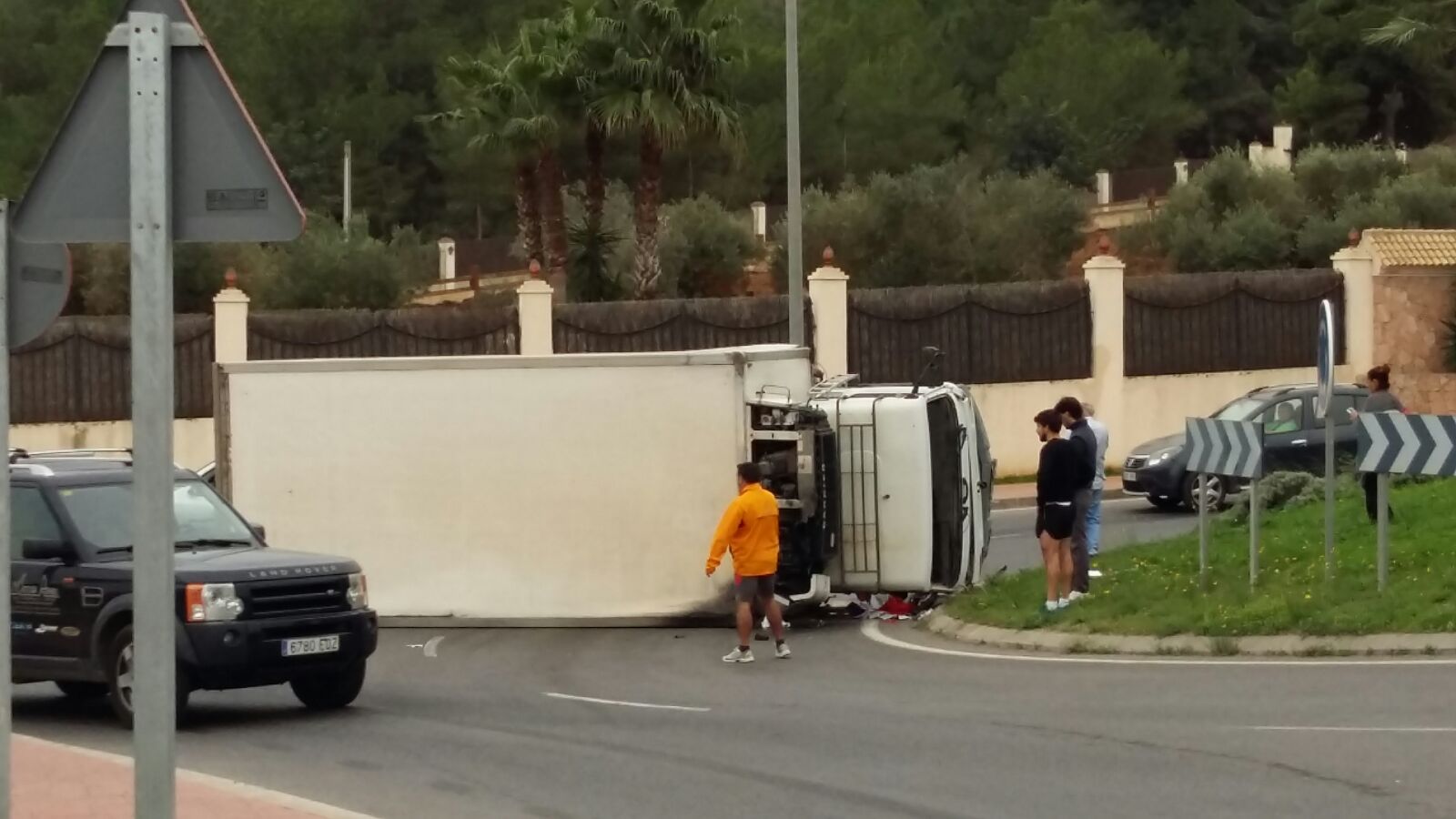 @Noudiari/Un camión ha volcado este sábado por la mañana poco después de las 9,00 horas en la rotonda de Sant Rafel, y ha quedado atravesado en los dos carriles de la glorieta.
