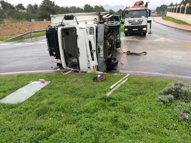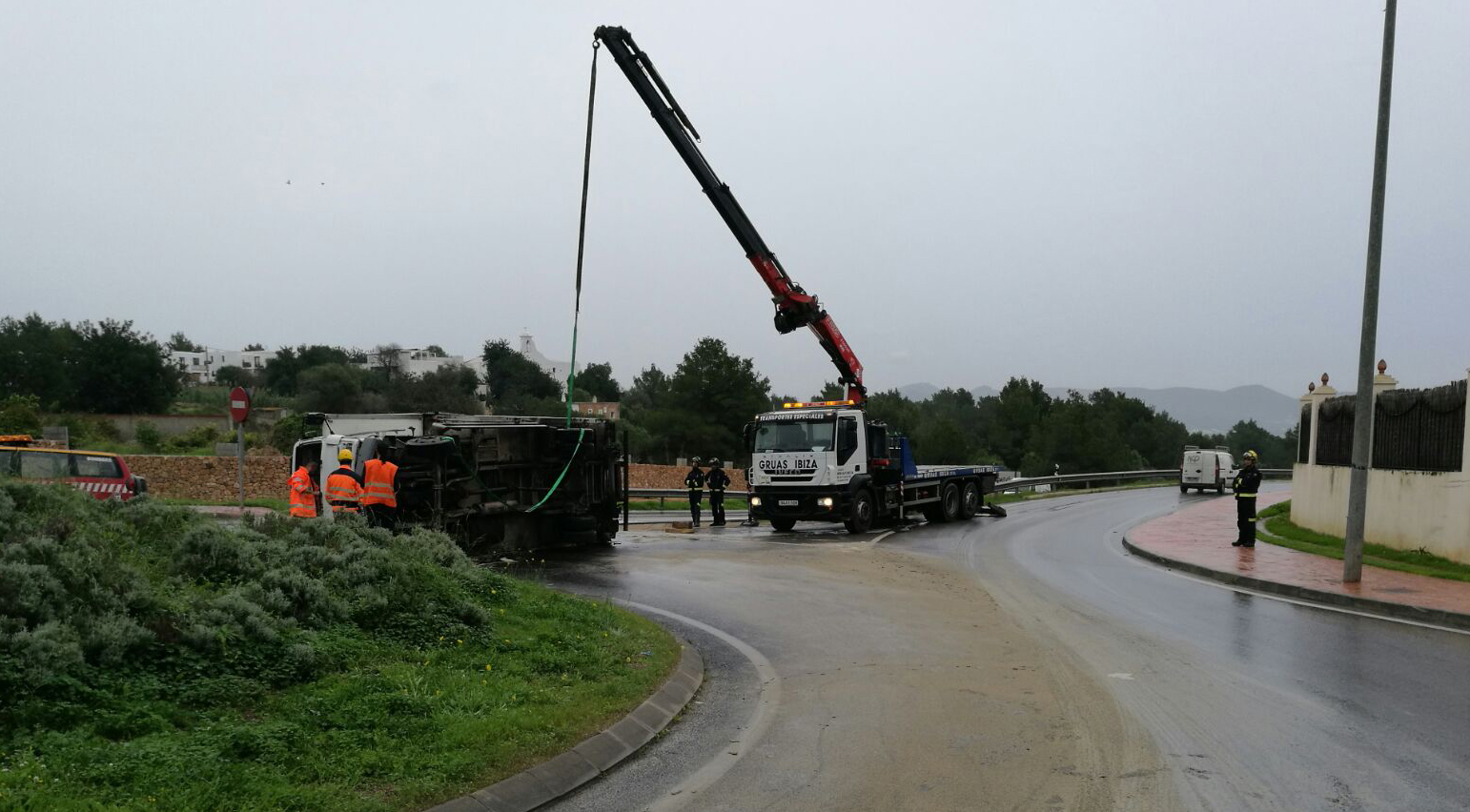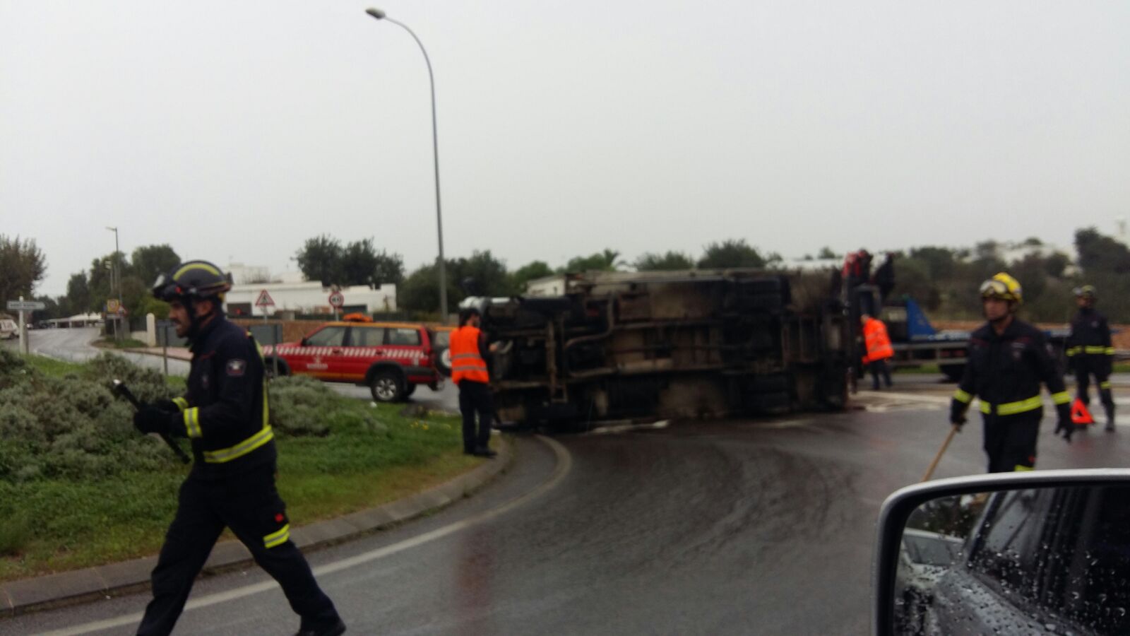 Los Bomberos de Ibiza han tenido que intervenir en el accidente debido a que el vuelco del camión ha provocado un derrame de aceite y diversos líquidos sobre el asfalto.