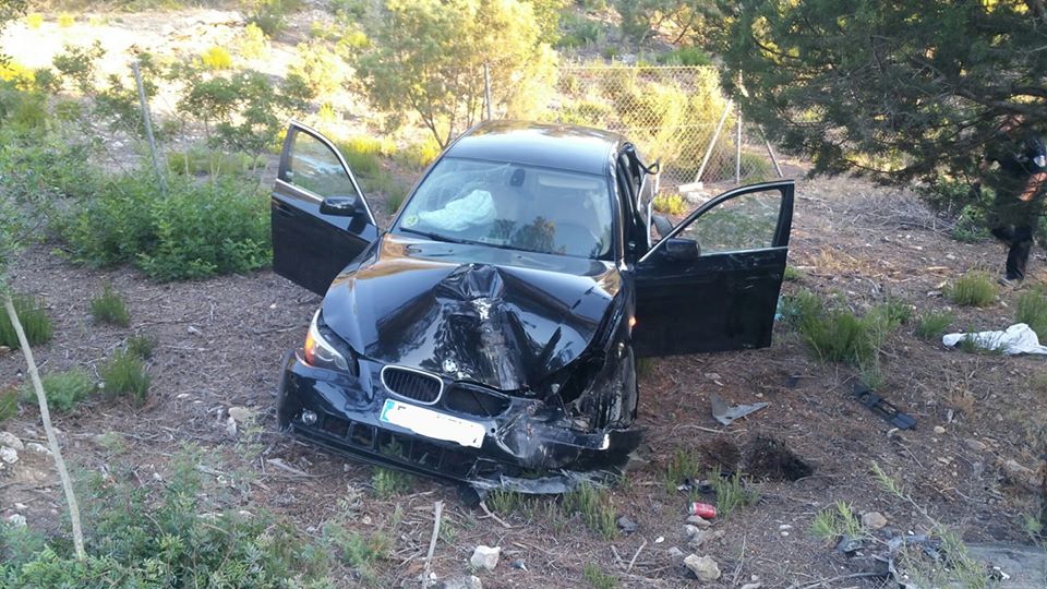 @Noudiari / El conductor de un BMW y su acompañante salieron ayer corriendo campo a través del lugar en el que estrellaron su coche tras un accidente producido, al parecer, por realizar una conducción «negligente» y a una velocidad «excesiva»en el municipio de Sant Josep.