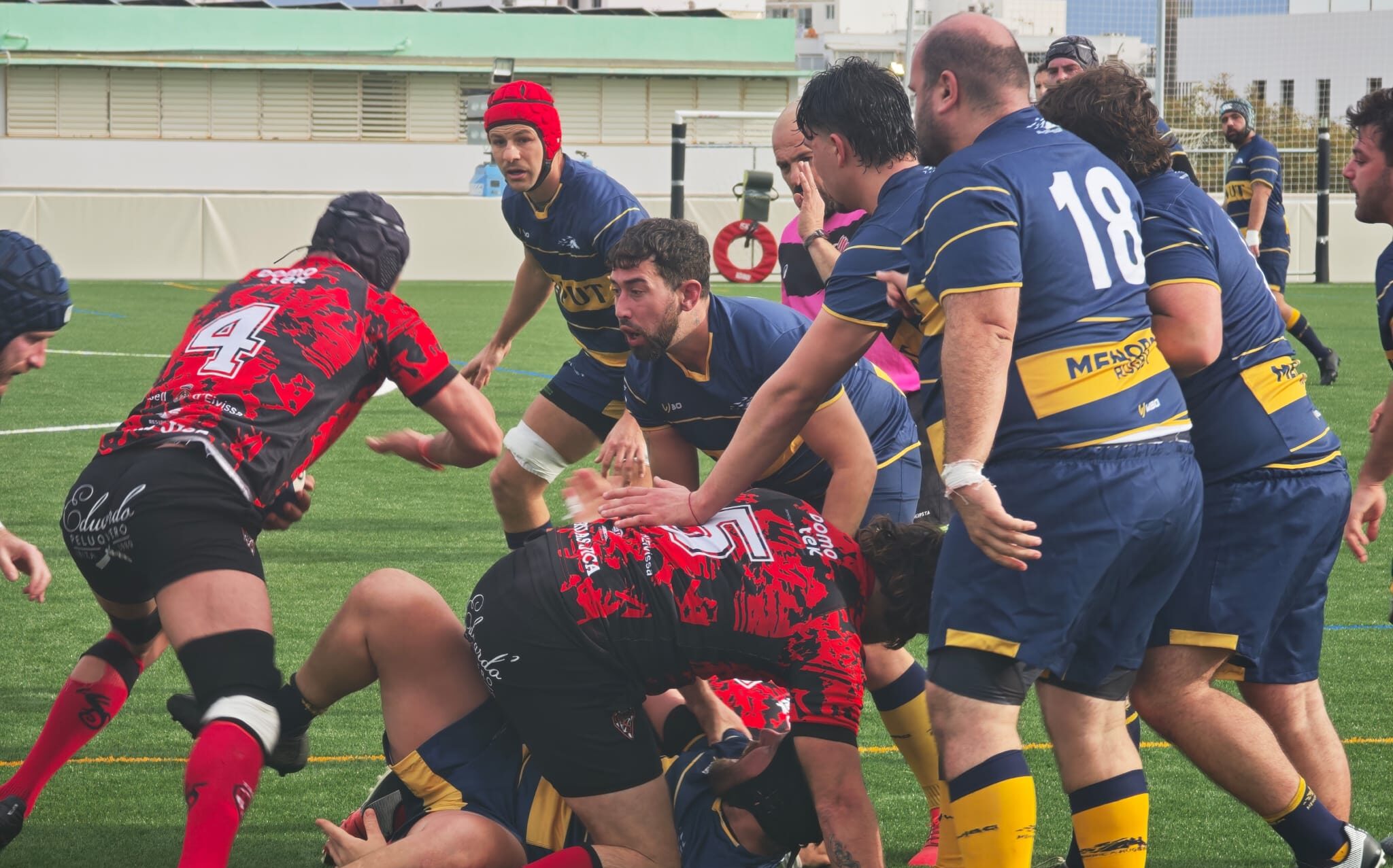 El Ibiza mostró una presión asfixiante en todas las líneas. Tanto la línea de tres cuartos (backs) como la delantera —los «gordos», que dominaron las formaciones fijas— impidieron cualquier intento de reacción de los menorquines. La superioridad física y táctica se tradujo en una seguidilla de ensayos que dejaron el marcador en un claro 32-0 al descanso.
