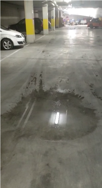El sótano donde se encuentra el depósito de vehículos de Ibiza, junto a la nave de Endesa, presenta hoy este aspecto, con charcos por toda la superficie y goteras que tratan de controlar con cubos de fregar y hasta con papeleras.