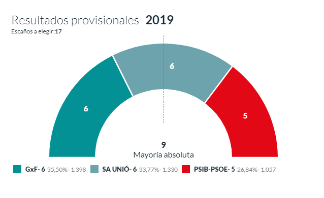 @Noudiari / Con la totalidad de los votos escrutados, GxF y Sa Unió han obtenido seis escaños cada formación en el Consell de Formentera, en el que estará también representado el PSIB-PSOE con cinco asientos, según los resultados provisionales de las elecciones celebradas este domingo.