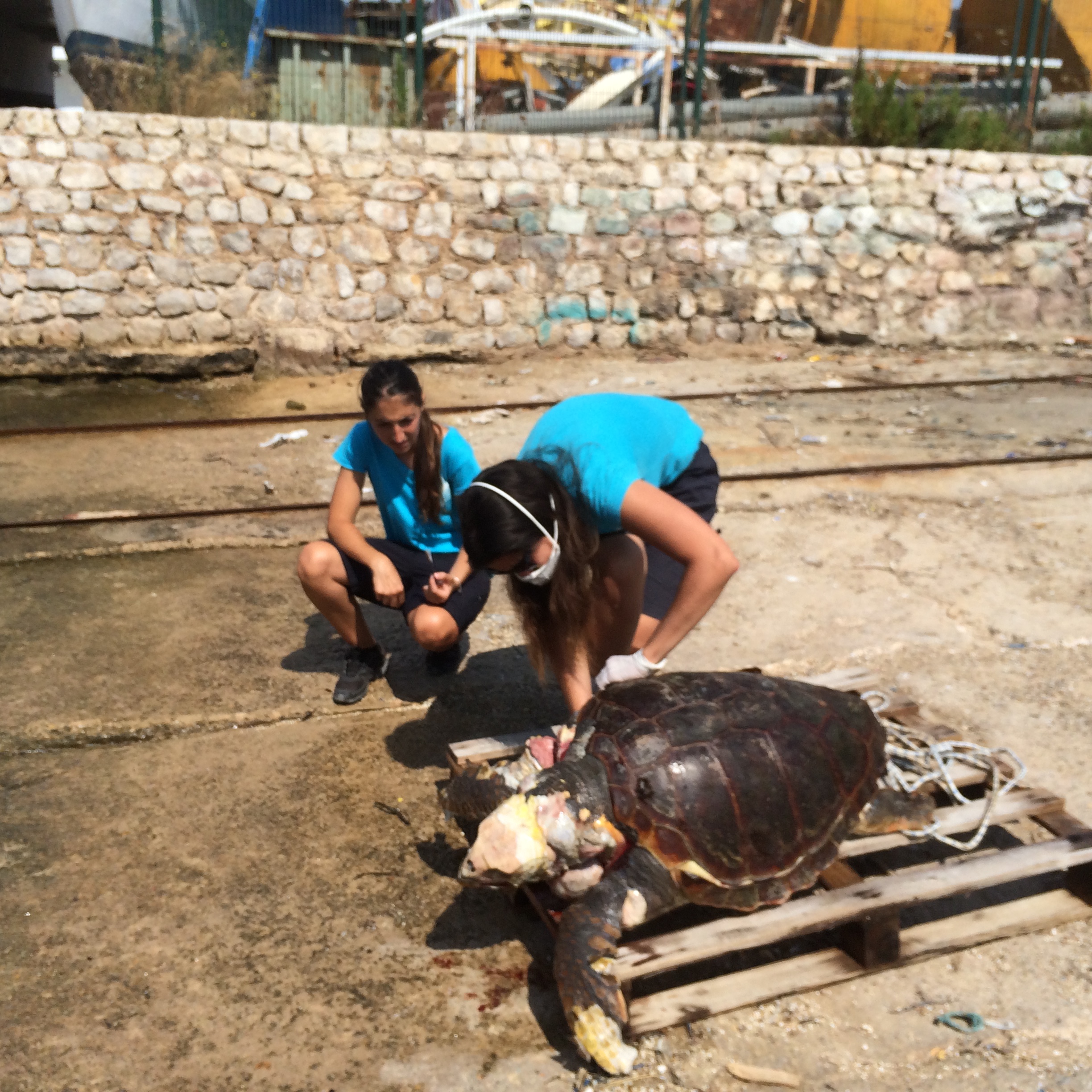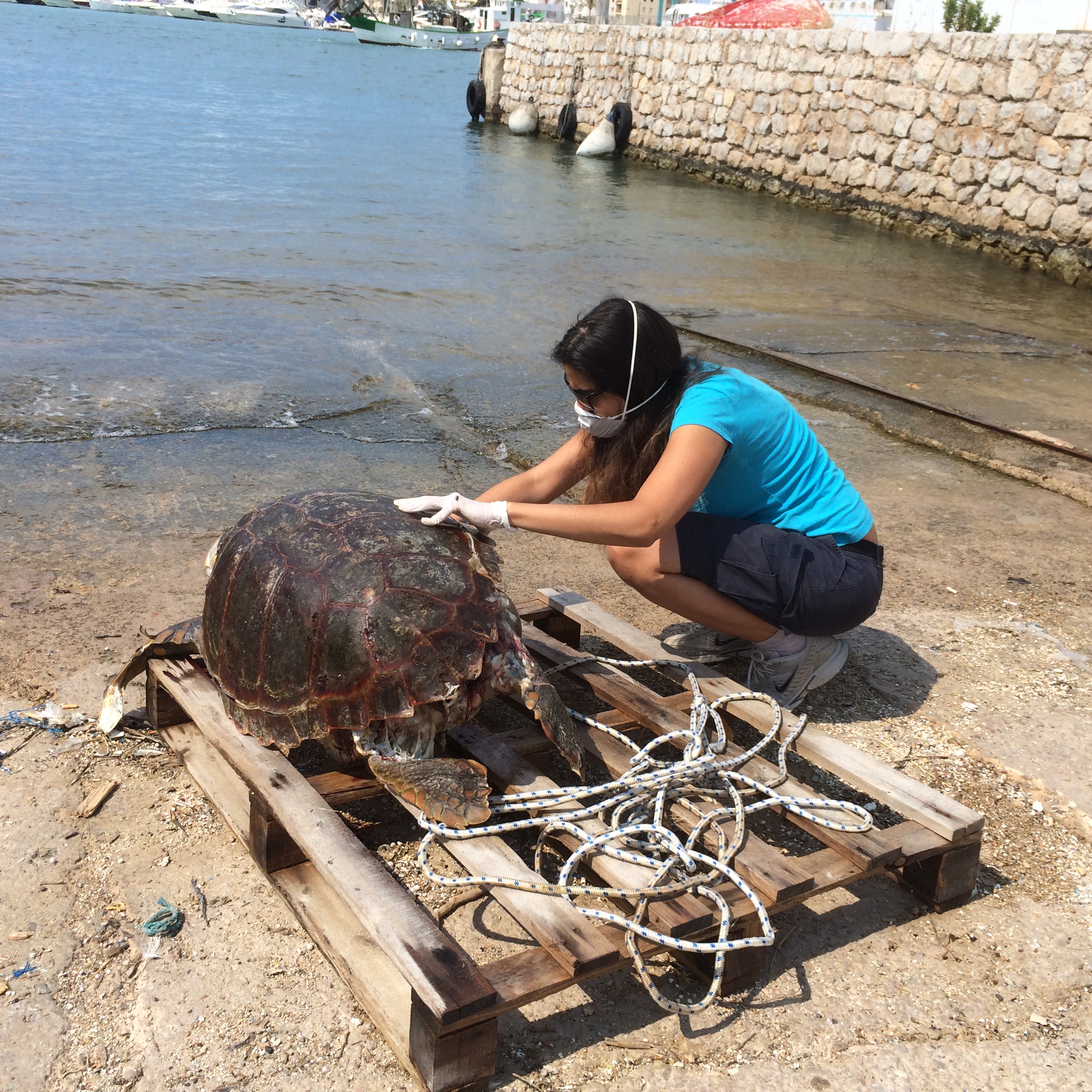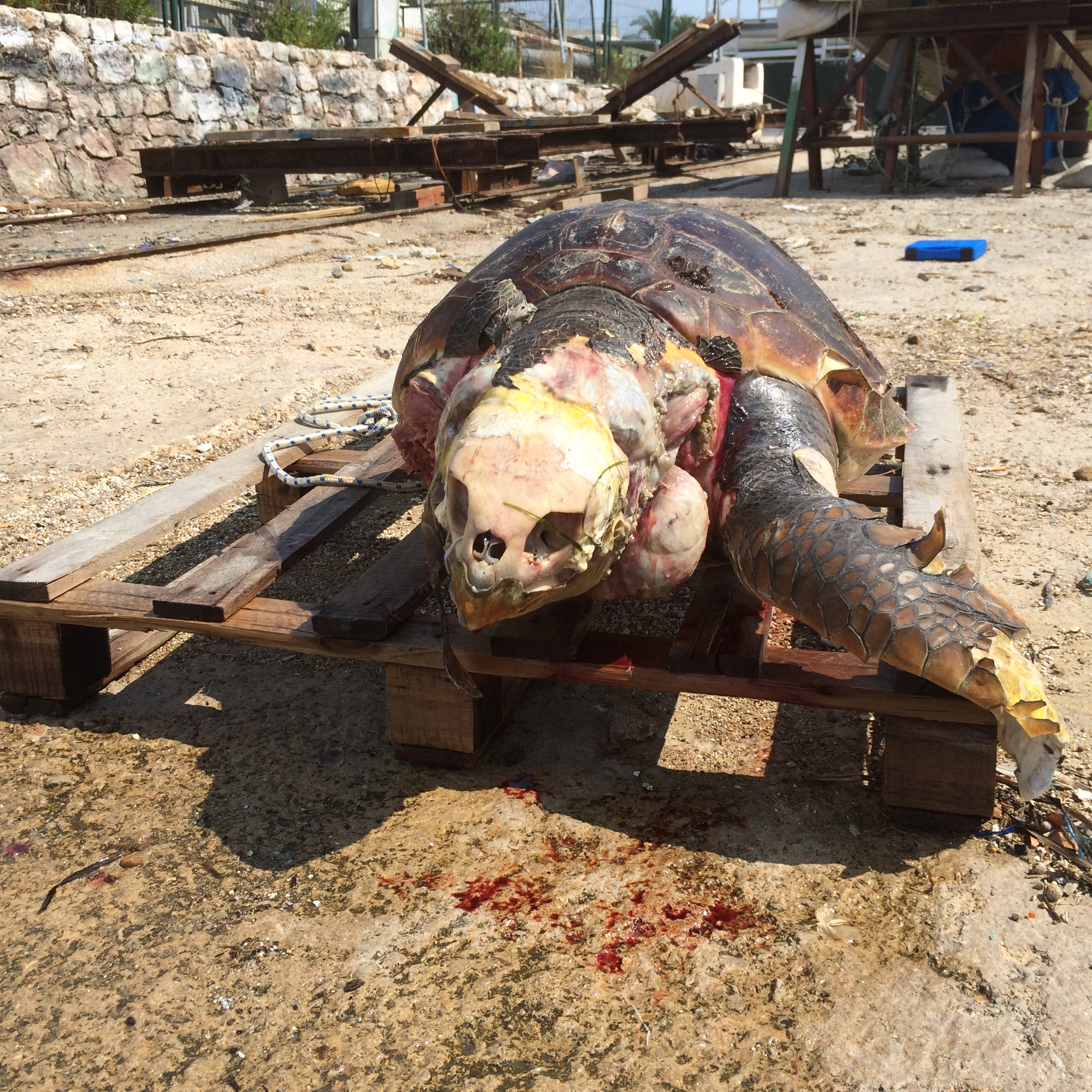 La tortuga hallada en el puerto de Vila medía 70 centímetros. Al igual que el ejemplar de Formentera, tras recoger muestras, ha sido transportada al vertedero.