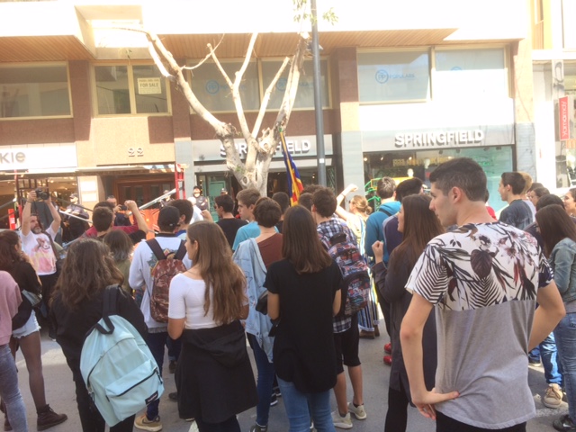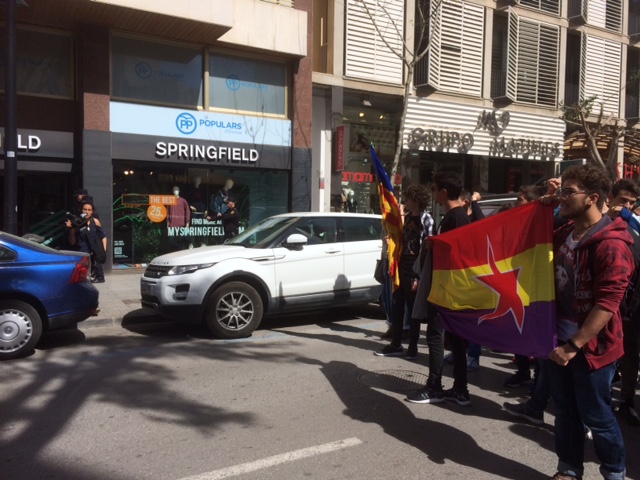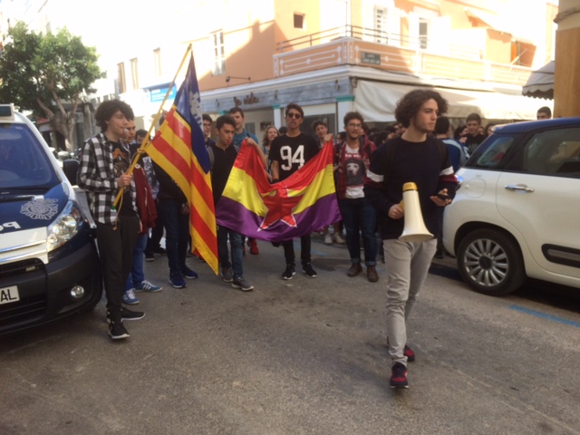 Con gritos de «Rajoy, capullo, al paro un hijo tuyo», «menos represión, más educación», «que la LOMCE se destroce» y «después de estudiar queremos trabajar», lemas enviados por el móvil desde el Sindicato Central de Estudiantes, según explicaba uno los alumnos, los jóvenes recorrieron algunas calles de la ciudad, con una bandera republicana del frente popular, seguidos por una decena de agentes de la Policía Nacional. Casi a la 13.00 horas, la pequeña manifestación llego a su objetivo, la sede del PP de Bartomeu Rosselló, para reclamar la derogación de la LOMCE.