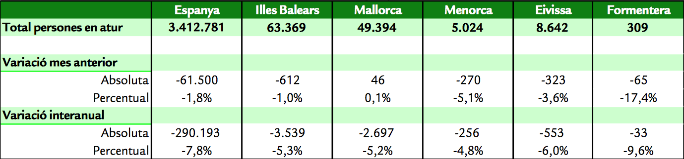 @Noudiari/El número de parados en las Islas Baleares del mes de diciembre fue de 63.369 personas, lo que representa un descenso de 3.539 personas (-5,3%) respecto al mes de diciembre de 2016. El paro cae en todas las islas, y de forma más acentuada en Formentera (-9,6%), seguido de Ibiza (-6,0%), Mallorca (-5,2%) y Menorca (-4,8%).