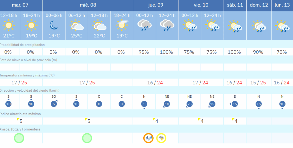 La Agencia Estatal de Meteorología (Aemet) ha activado la alerta naranja en Ibiza y Formentera para este jueves, 9 de octubre, ante la previsión de lluvias intensas y tormentas asociadas a una nueva DANA que afectará al archipiélago balear.