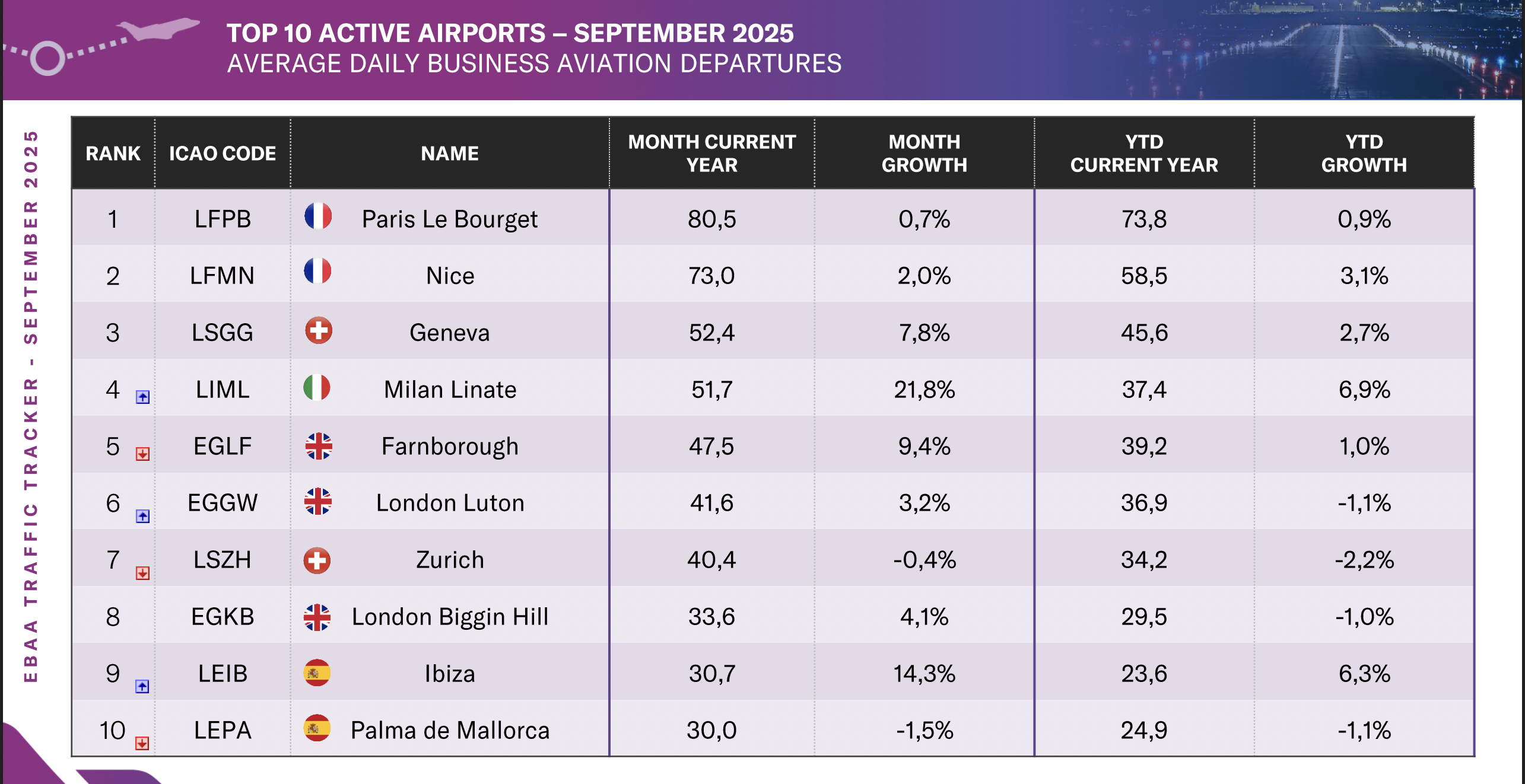 El aeropuerto de Ibiza (LEIB) se sitúa así en el puesto número 9 de los aeropuertos más activos de Europa en aviación privada en septiembre con 30,7 despegues diarios de media (más despegues que en Palma, que es un aeropuerto de dimensiones mucho más grandes que el ibicenco) y 13.365 operaciones en el acumulado anual.
