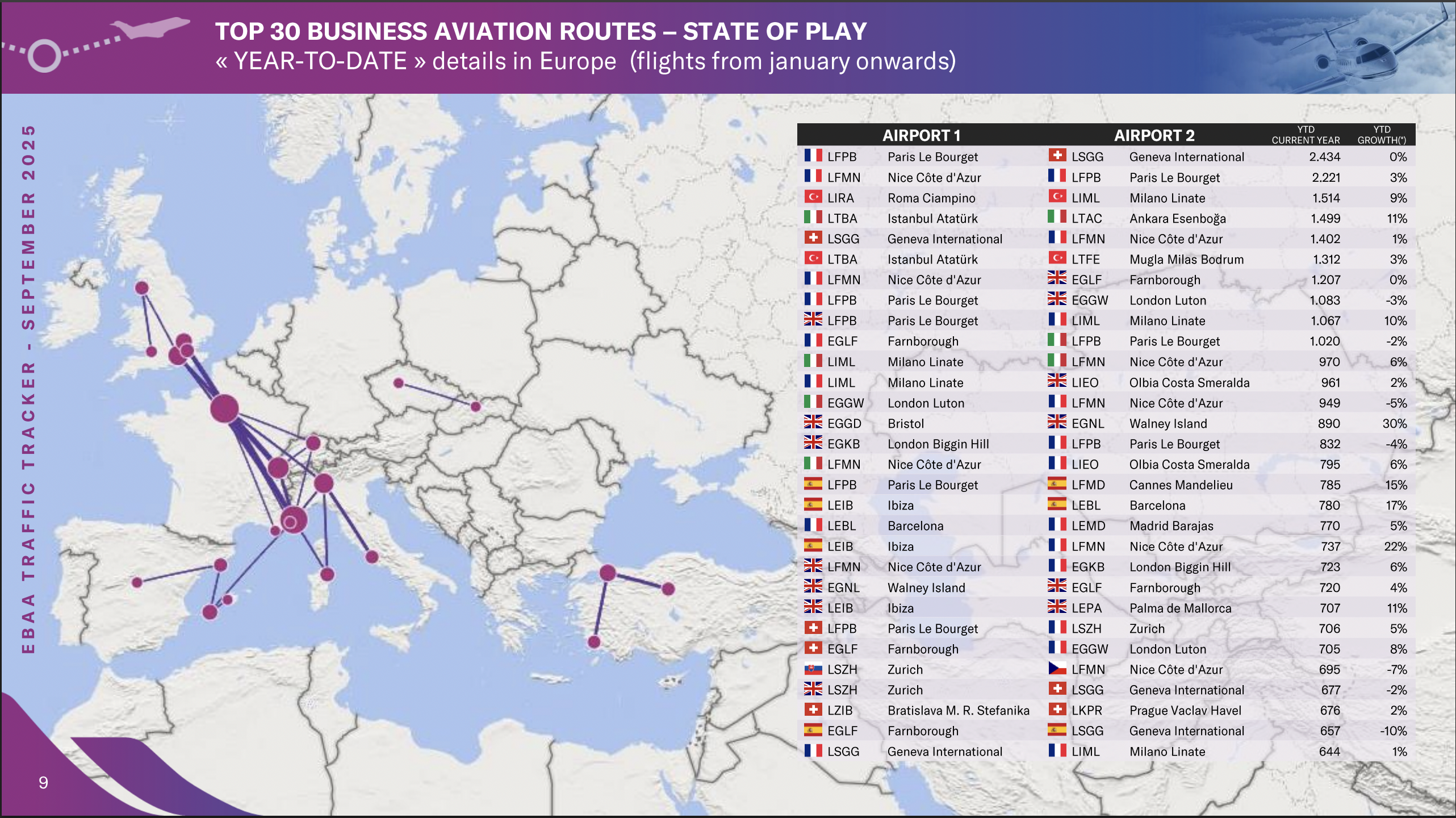 Ibiza–Niza (Costa azul, uno de los destinos preferidos del turismo de lujo europeo), 737 vuelos (+22%).