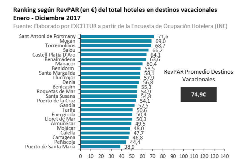 Dentro de los destinos baleares, Exceltur destaca notablemente la isla de Ibiza, con tres municipios entre los diez españoles con mayor nivel de RevPAR y crecimiento del empleo en el año 2017: la ciudad de Ibiza lidera con 131,9€ el ingreso medio por habitación en toda España en el año 2017, gracias a un aumento del +7,4% del RevPAR respecto a 2016, lo que ha permitido un incremento del +11,0% en el empleo turístico.