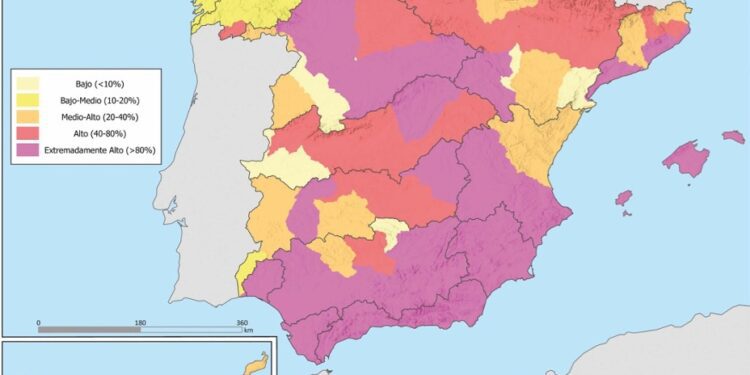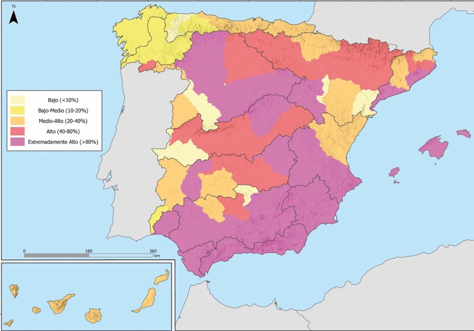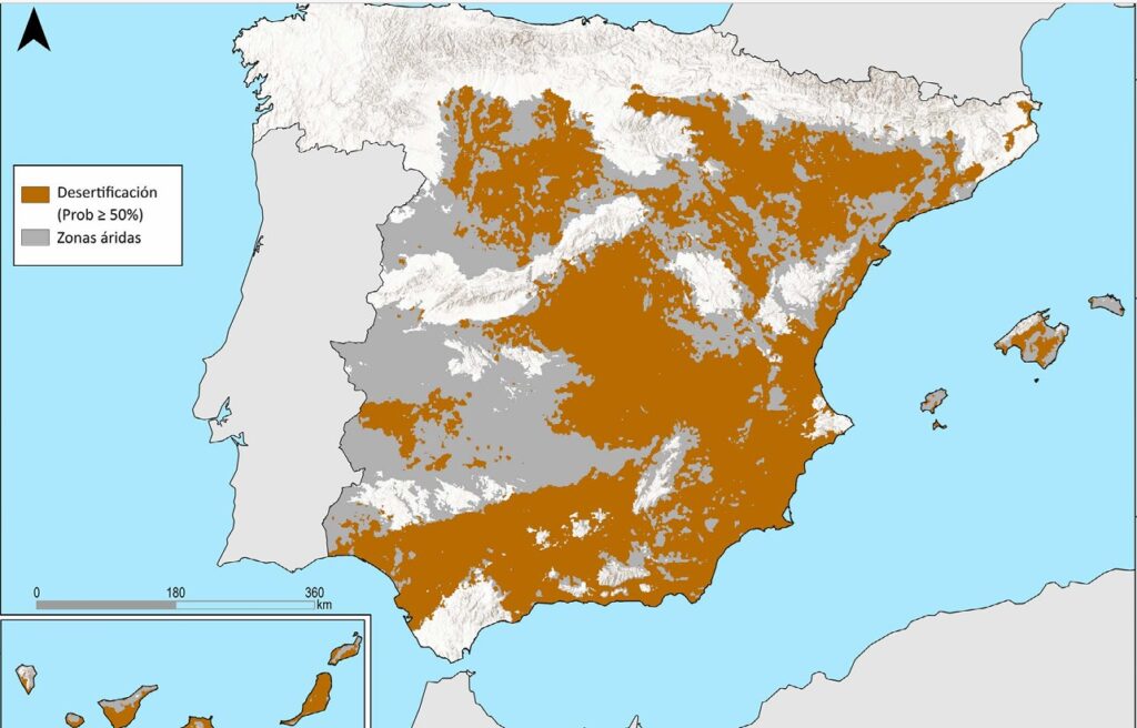 Este estudio se ha realizado mediante la aplicación de predictores a través de una herramienta de Inteligencia Artifical conocida como Random Forest, un algoritmo de uso muy común entre los expertos en la ciencia de los datos. Para alimentar el algoritmo, se ha incluido un amplísimo abanico de datos, desde variables climáticas -lluvias, riesgo de sequía, aridez, temperatura-, socioeconómicas -cambio de uso de suelo, demografía, cobertura del suelo-, y variables biofísicas -productividad agraria, carbono orgánico del suelo, biodiversidad, estado de las masas de agua subterránea-.