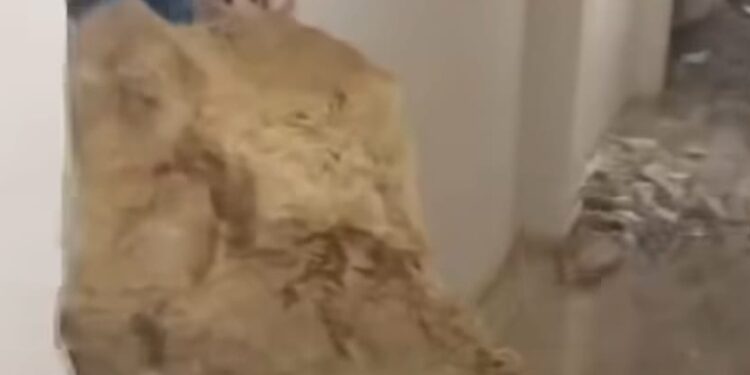 En estas imágenes vemos como los bomberos acceden a esa zona del hotel, el pánico de los turistas alojados, y las enormes dimensiones de la roca que cayó sobre el edificio e impactó sobre la pared de un pasillo, reventando el tabique.