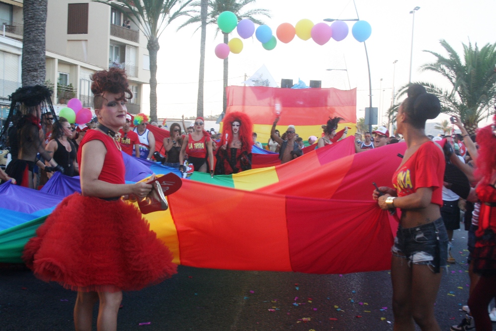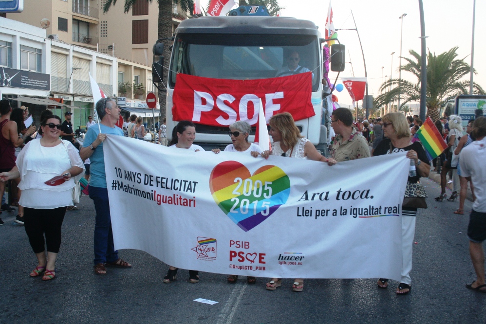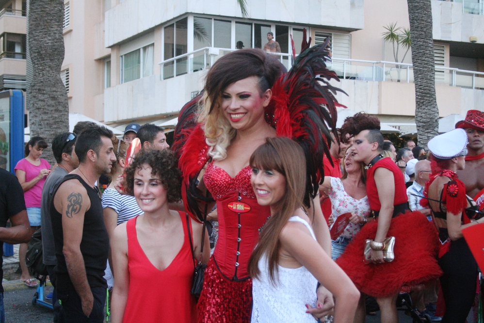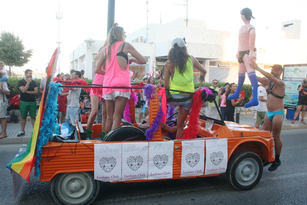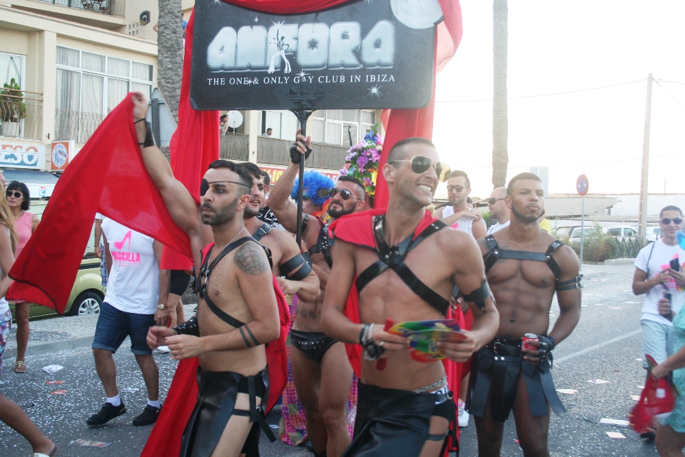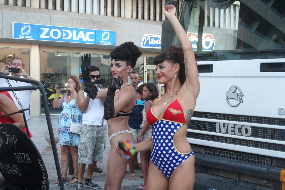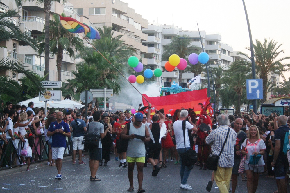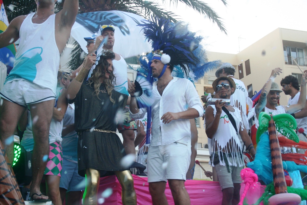 Posteriormente, era el turno de las carrozas, con cinco camiones, un jeep y un Hummer, precedidas por un pasacalles de La Troya y dos enormes banderas de la comunidad LGTB. Entre las carrozas destacaban la del PSOE, que repartía caramelos entre los asistentes, y las de la asociación de la calle de la Virgen, pionera del movimiento gay en Ibiza y, cerrando la marcha, la de otro club nightclub señero en la isla como es el Ánfora.