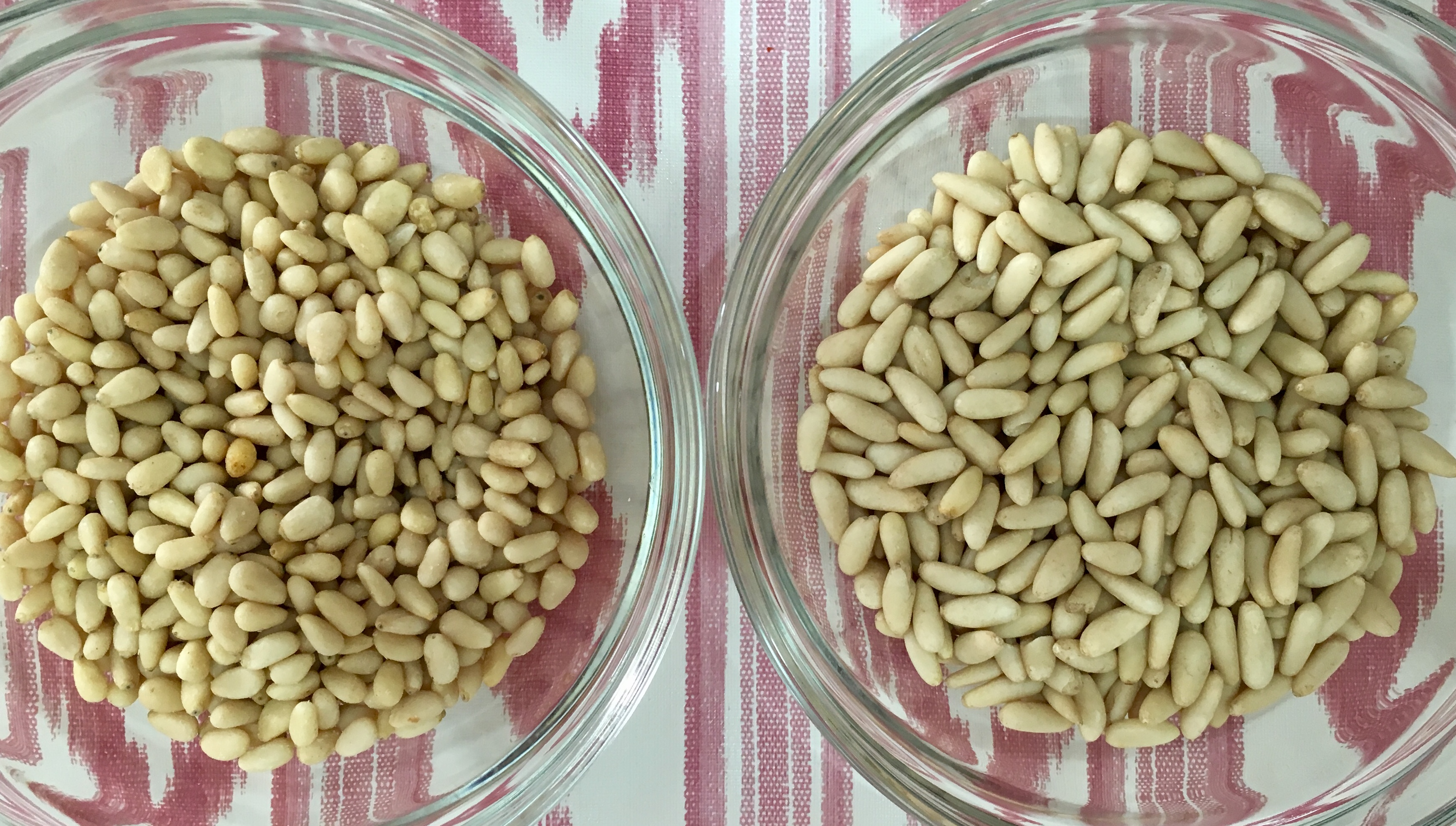 El precio del piñón español, que es el que está considerado de mayor calidad, ronda los 60 euros el kilo, mientras que el de China cuesta la mitad, pero como se aprecia en la foto, el piñón chino es más corto e irregular mientras que el español es largo y homogéneo.