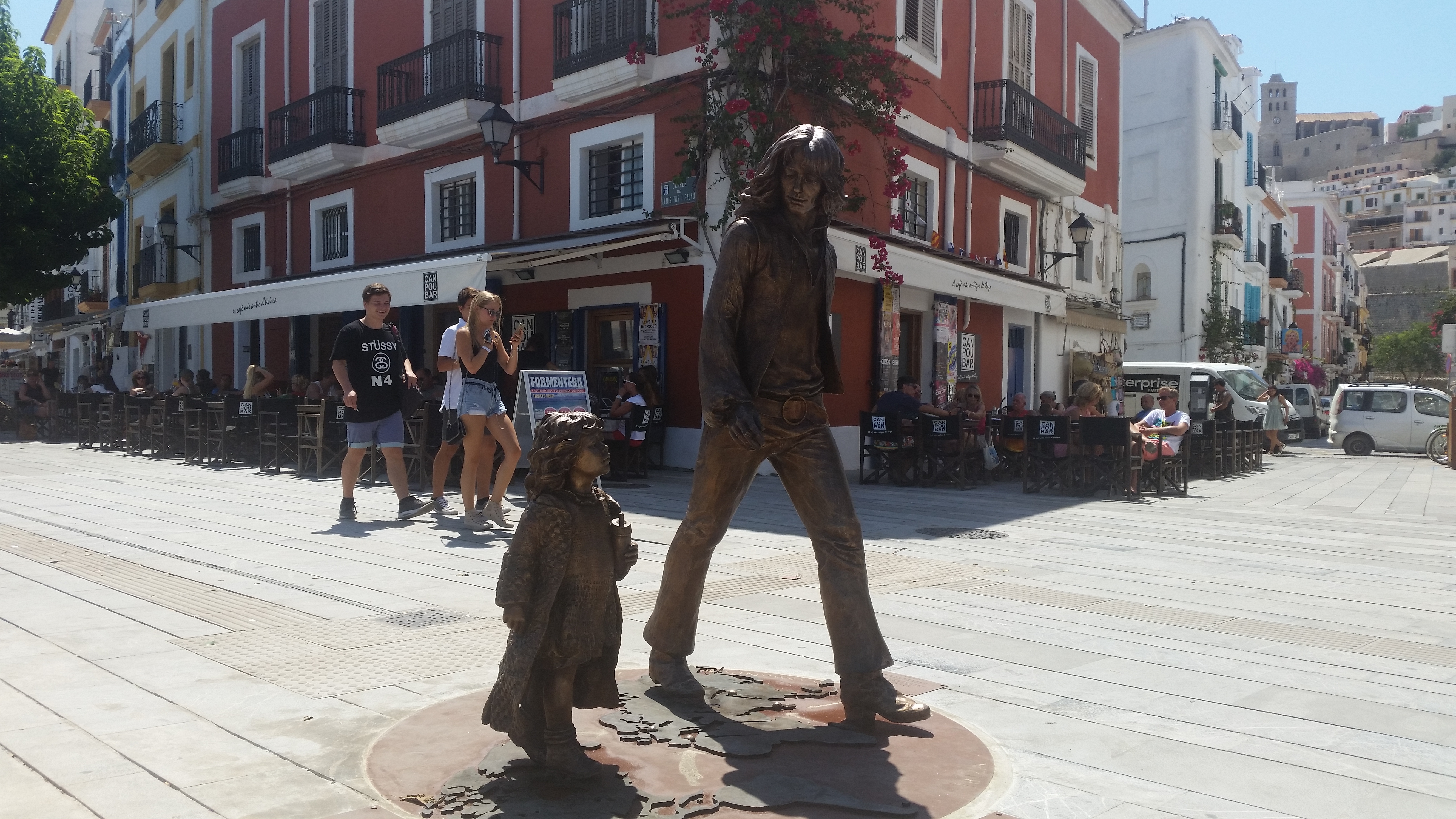 Muy mona la estatua de unos hipis holandeses junto a la tienda de PACHA.