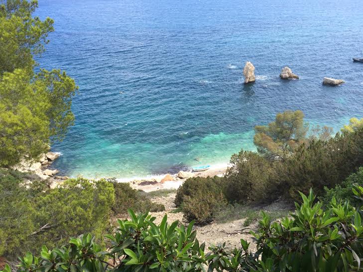La barca todavía es visible en es Niu de s’Àguila, una oculta e inaccesible playa, que se encuentra a los pies de los acantilados que caracterizan el litoral suroeste de Ibiza.