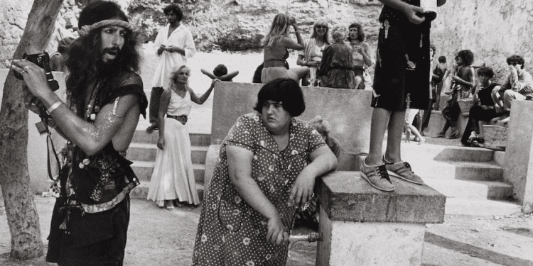 Esto es lo que observamos, a primera vista, en Hippies, una foto icónica de Ibiza tomada en 1976 por el fotógrafo Oriol Maspons (Barcelona, 1928-2013). Mapons, enamorado de Ibiza, tomó muchas imágenes en la isla, pero esta es la única seleccionada para una exposición dedicada al singular fotógrafo que se puede ver desde el pasado 17 de diciembre y hasta el 12 de abril en la Real Academia de Bellas Artes de San Fernando de Madrid.