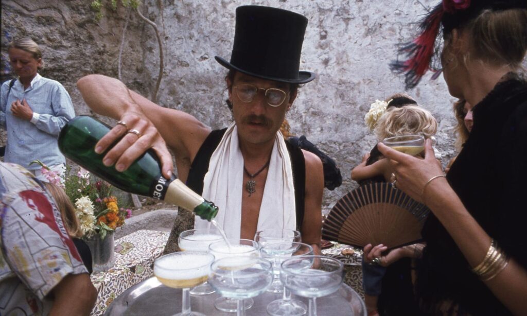 Pero hay otra fotografía icónica que salió de la misma fiesta. Tan icónica que acabó apareciendo en una secuencia de la película de Pedro Almodóvar Madres paralelas. «Exacto, ella es Jean que porta un cabestrillo en el que llevaba a su bebé Zoltan y una copa de champán en la mano. Oriol Maspons hizo esa foto y se convirtió en otra imagen muy famosa del mismo día», relata Rudnick.