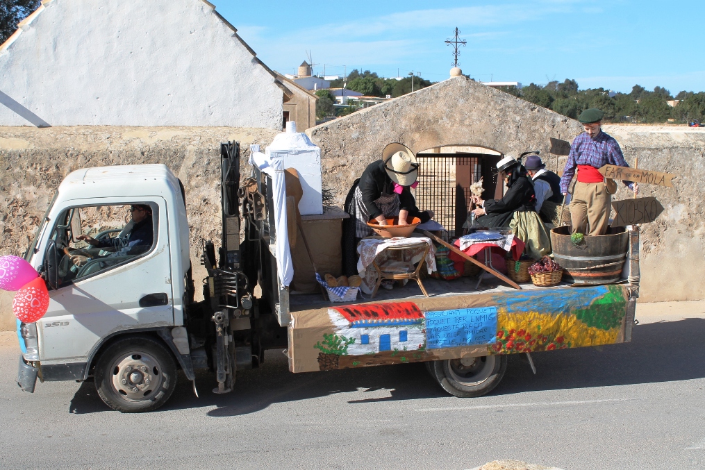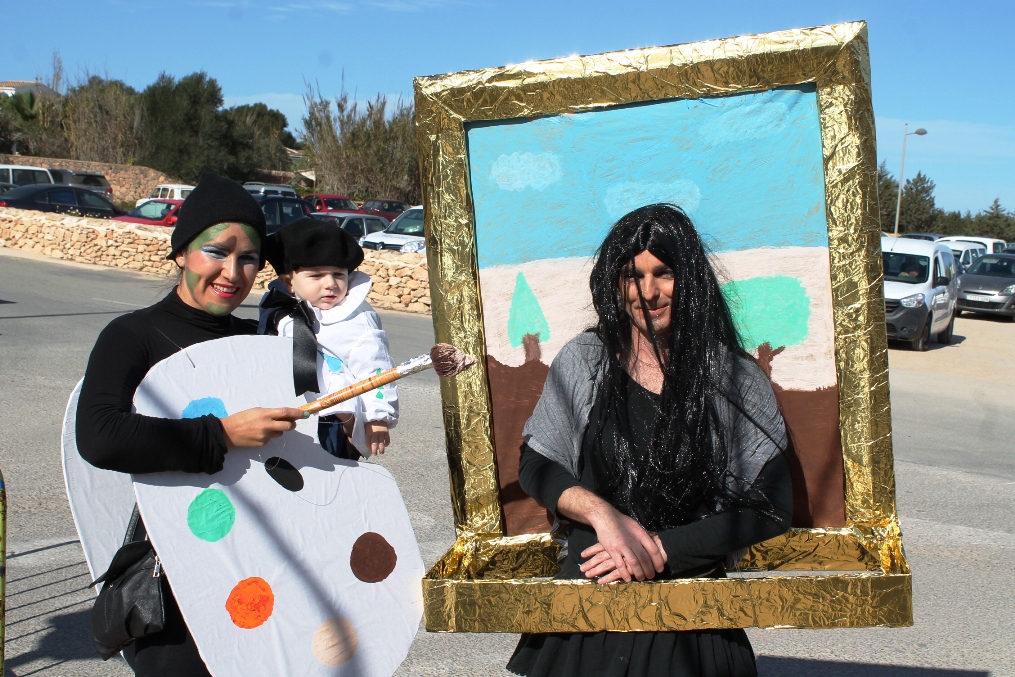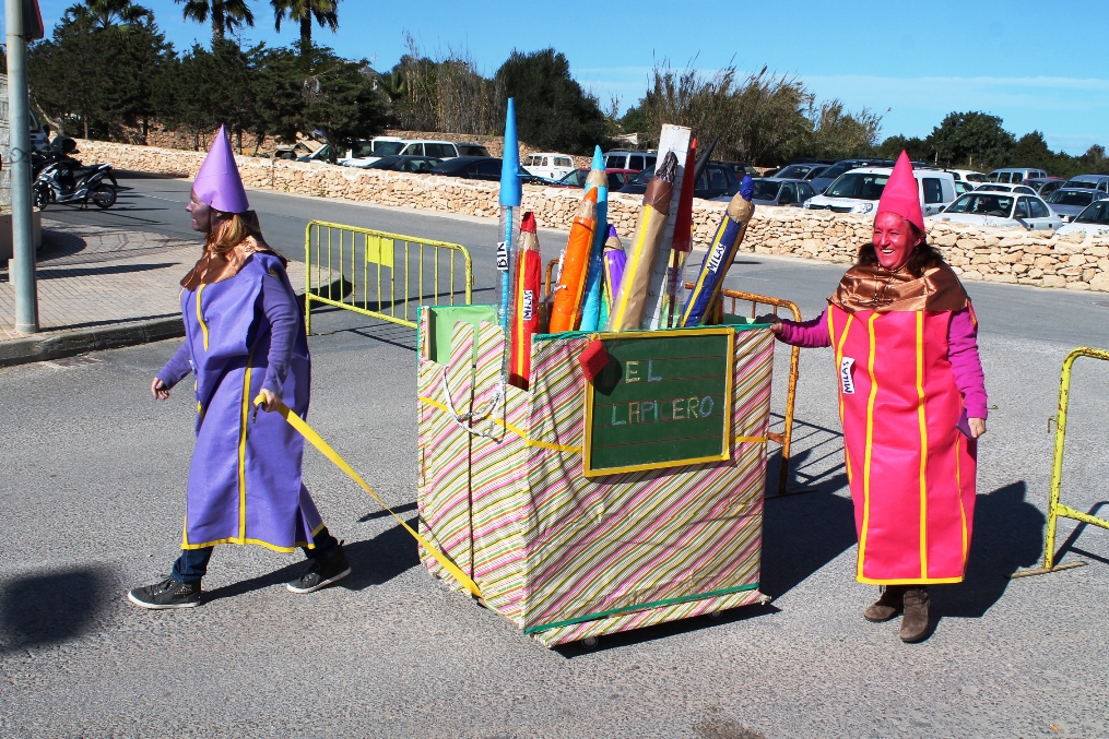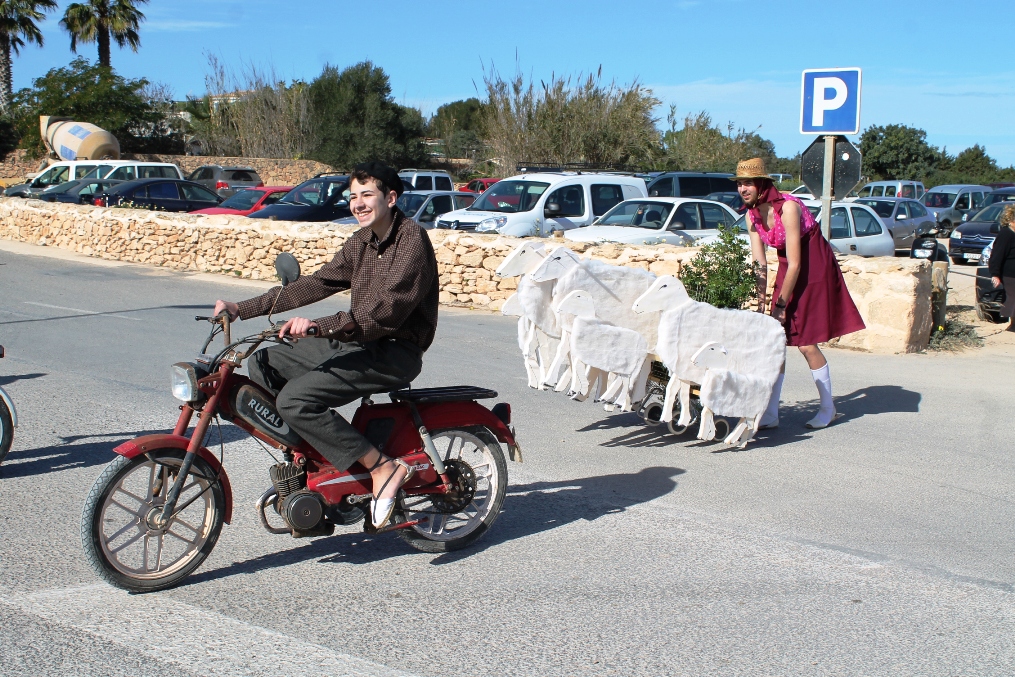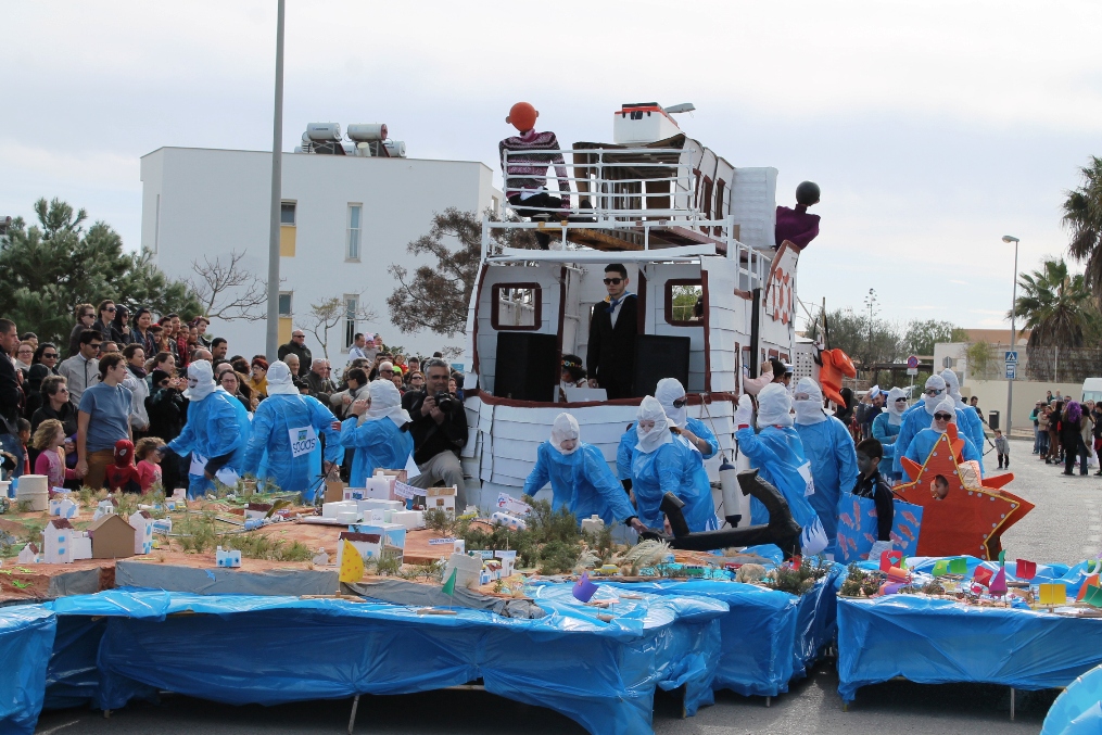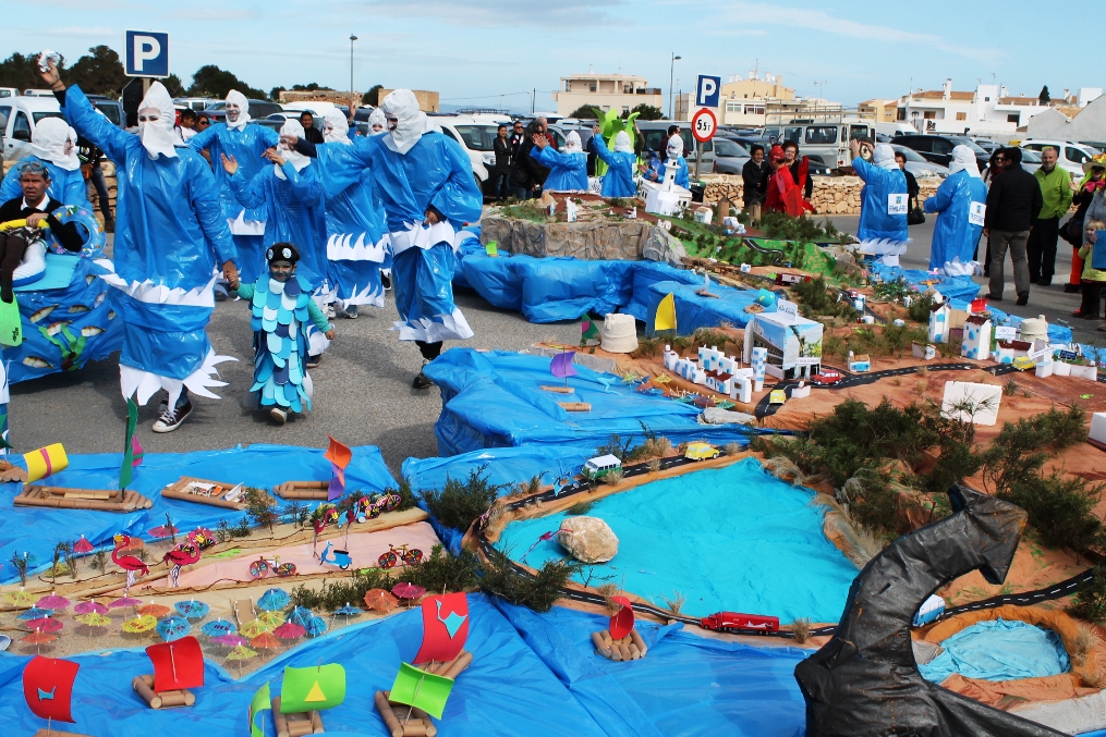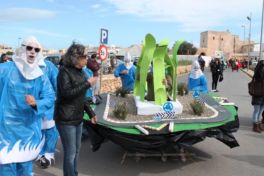 Las otras dos carrozas tenían igualmente mucho mérito, una de payeses compadreando con hippies, mezclando tareas tradicionales, mobylettes, tractores, minifaldas, desparpajo y ovejas entre otros, mientras que el Col.legi Públic de sant Ferran ha escenificado una encendida defensa del Mare Nostrum del que el lema era claro ‘Al mar, peixos i sal, oli no cal’ en el que sobre vestimentas negras aparecían todo tipo de especies marinas. Además de Joven Dolores, isla y rotonda, los otros premiados fueron La niña del exorcista, La Gioconda y Lego.