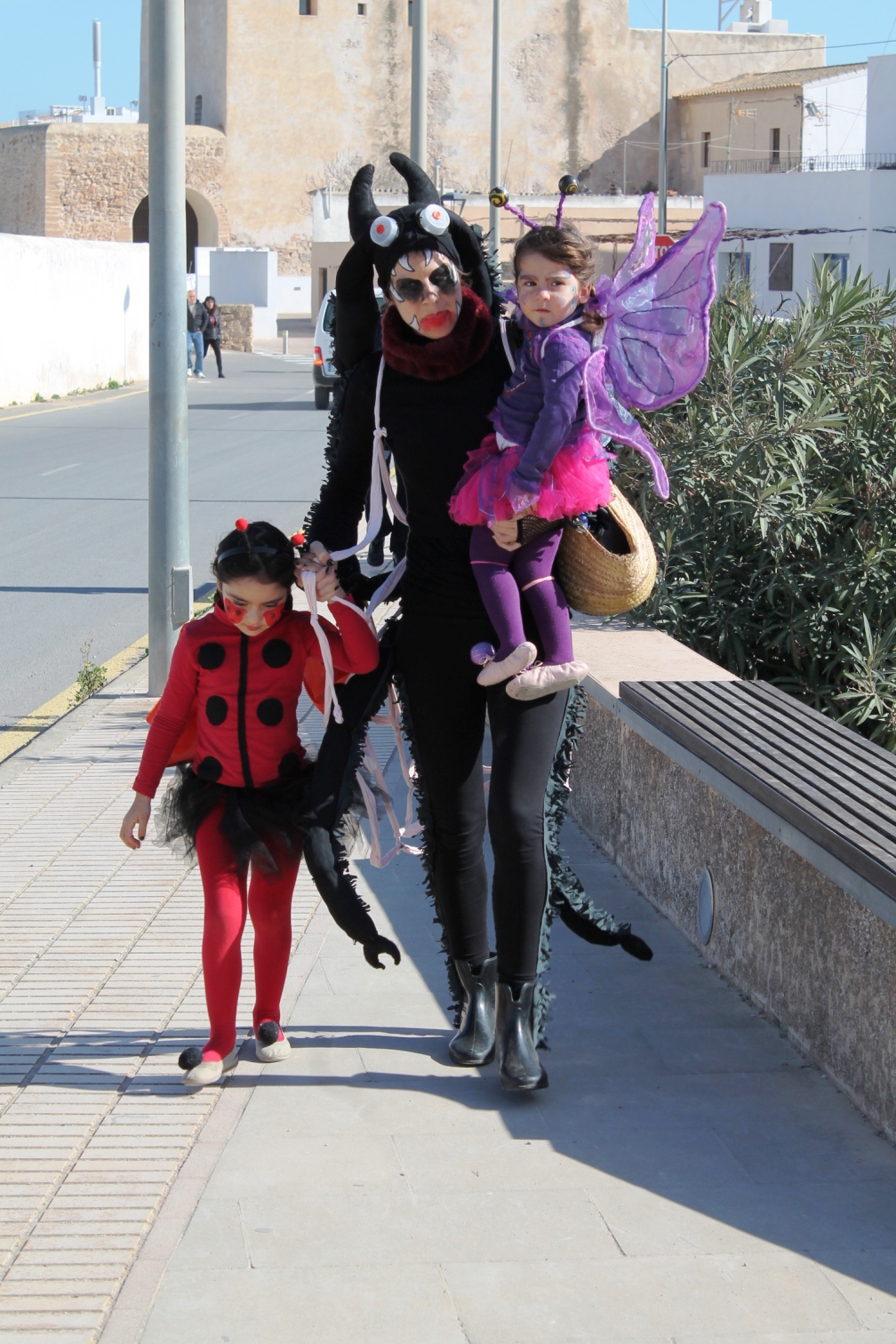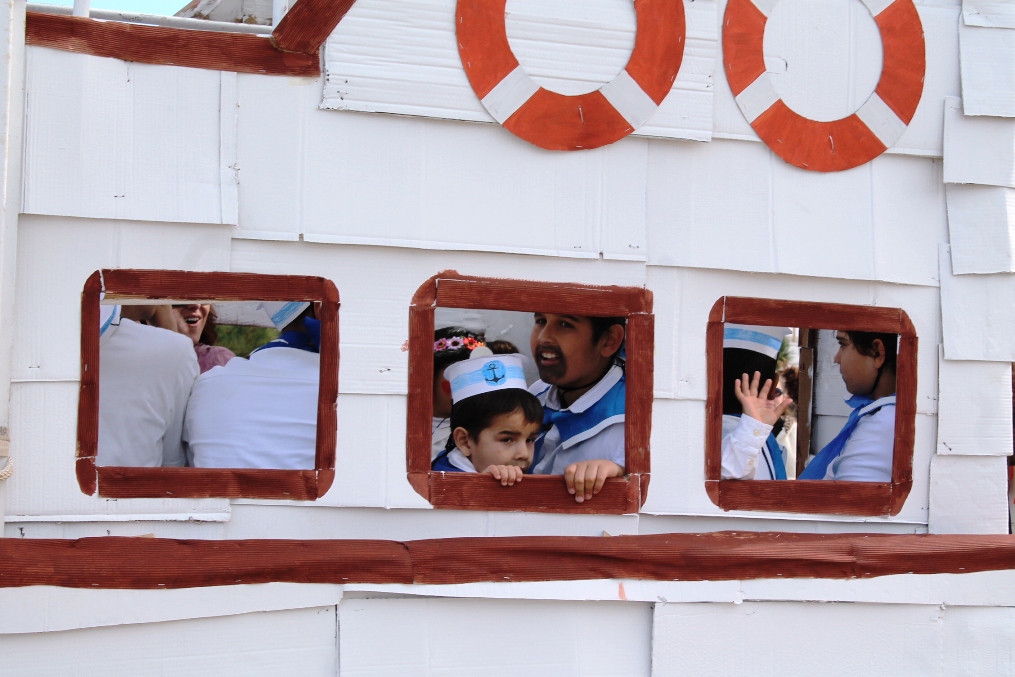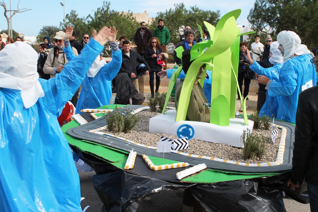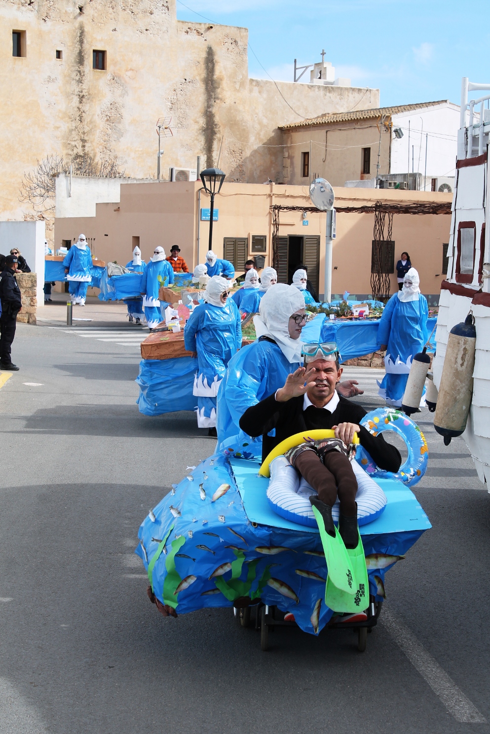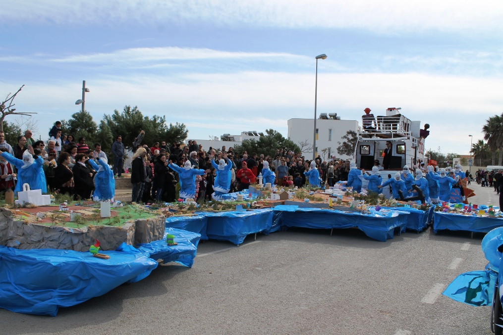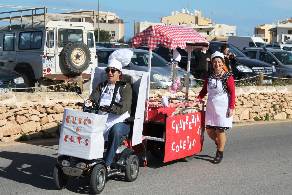Las otras dos carrozas tenían igualmente mucho mérito, una de payeses compadreando con hippies, mezclando tareas tradicionales, mobylettes, tractores, minifaldas, desparpajo y ovejas entre otros, mientras que el Col.legi Públic de sant Ferran ha escenificado una encendida defensa del Mare Nostrum del que el lema era claro ‘Al mar, peixos i sal, oli no cal’ en el que sobre vestimentas negras aparecían todo tipo de especies marinas. Además de Joven Dolores, isla y rotonda, los otros premiados fueron La niña del exorcista, La Gioconda y Lego.
