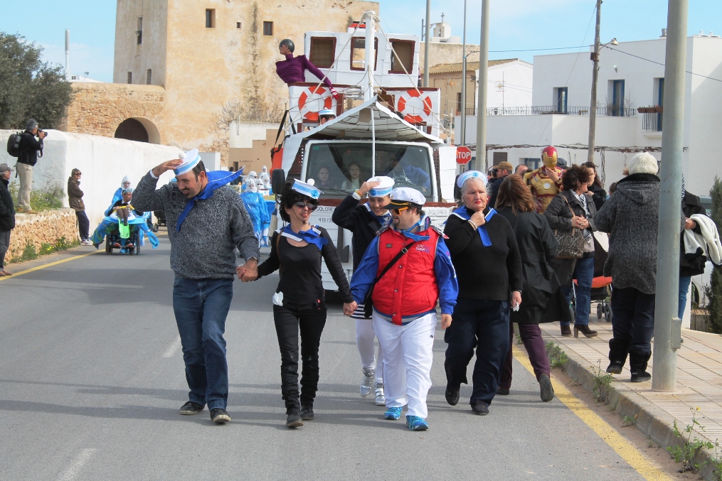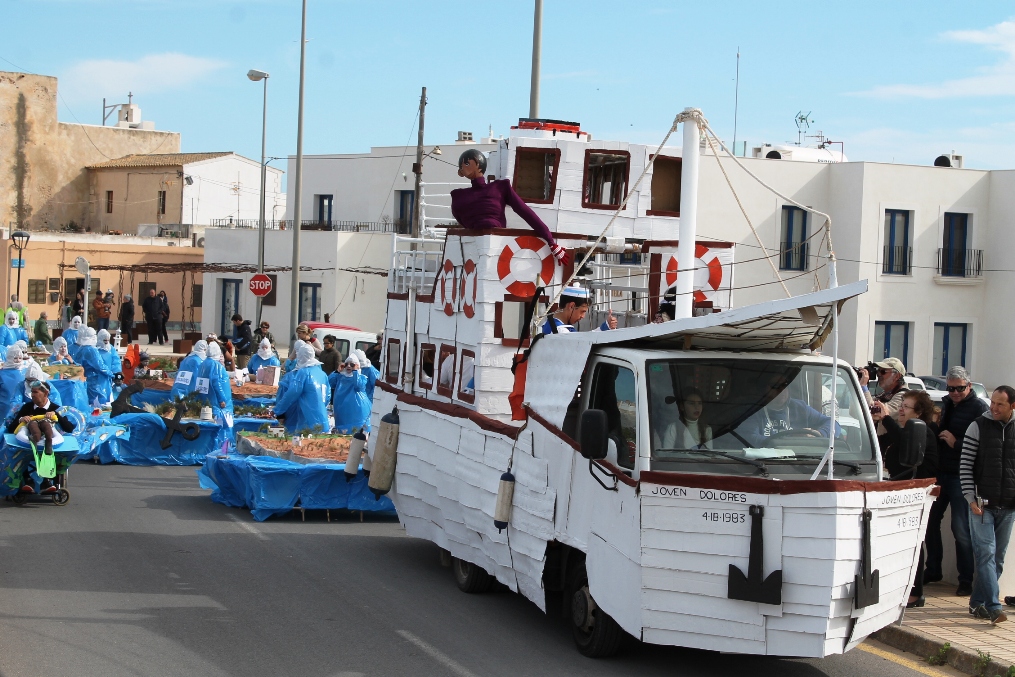 @G. Romaní / La vieja Joven Dolores, un hito/mito en la historia de Formentera, ha ganado merecidamente el primer premio de carrozas en el carnaval celebrado en Sant Francesc. La carroza estaba formada por tres partes, la primera de las cuales era una réplica de la Joven Dolores, un barco histórico para la Pitiusa menor, en segundo lugar figuraba un inmenso puzzle conformado por 11 piezas de alrededor de dos por dos metros que unidas conformaban la totalidad de la isla con sus elementos más representativos, iglesias, faros, torres, kioskos de playa, higueras u ovejas y, finalmente, cerraba el séquito la rotonda de la posidonia, la que está situada frente al Centre de Dia que cuenta con una escultura de Aaron Keydar inspirada en la posidonia oceánica.